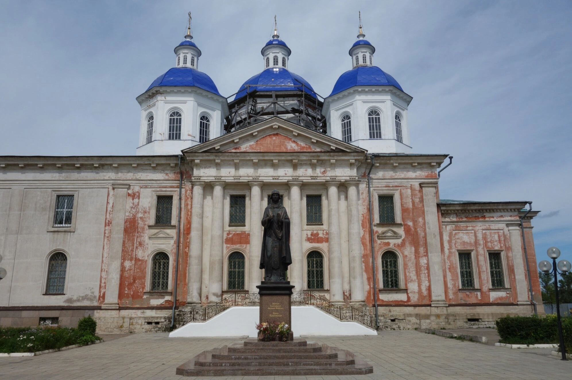 На представленной фотографии запечатлён Воскресенский кафедральный собор, расположенный в древнем городе Кашине Тверской области. На переднем плане снимка находится бронзовый памятник святой благоверной княгине Анне Кашинской, установленный у стен храма. Собор, возводившийся на протяжении 1796–1867 годов, является одним из самых грандиозных храмовых сооружений Тверской земли. Его архитектура отличается монументальностью: композиция включает апсиду, пятиглавый храм, трапезную и трёхъярусную колокольню высотою более 70 метров. Фасады украшены шестиколонными портиками тосканского ордера, а завершают строение три синих купола, увенчанных крестами. В настоящее время центральный купол находится в процессе реставрации, что видно по установленным строительным лесам.