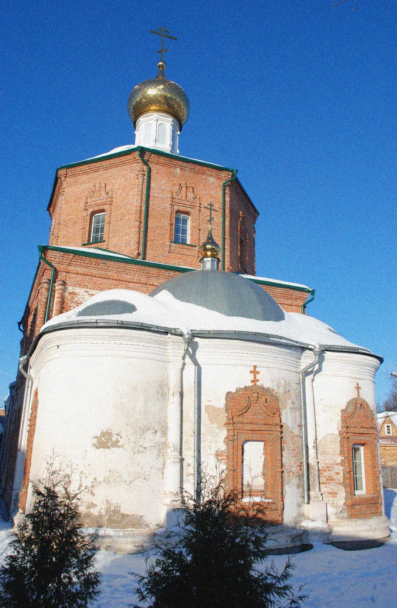 В зимний период, когда был сделан данный снимок, собор приобретает особую, созерцательную красоту. Иней украшает ветви кустарников на переднем плане, а чистое белое покрывало снега оттеняет насыщенный красный цвет кирпича и благородное золото куполов. Главная глава, увенчанная крестом, сияет даже в рассеянном свете пасмурного дня, напоминая о вечном свете Евангелия.