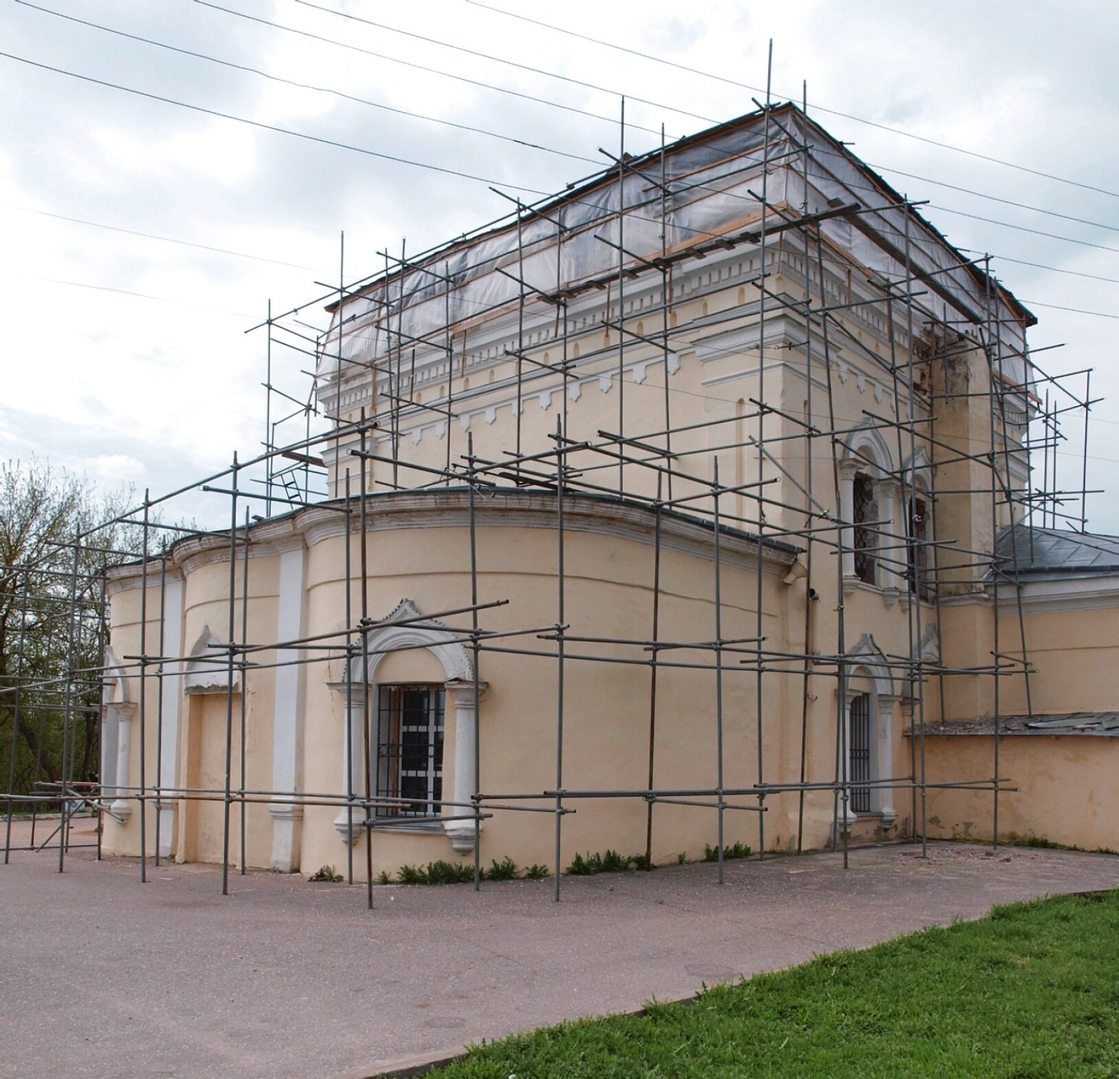 На представленной фотографии запечатлён Воскресенский собор, являющийся главным православным храмом города Рузы Московской области. Каменный пятиглавый собор был возведён в первой половине XVIII века на месте обветшавшей деревянной церкви и капитально перестроен в стиле классицизма в 1846–1855 годах по проекту архитектора Д. Г. Гущина. На снимке собор запечатлён в процессе проведения комплексных реставрационных работ. Фасад светло-жёлтого цвета частично скрыт строительными лесами, а купола и кровля укрыты защитным материалом для сохранения от воздействия непогоды во время восстановительных работ.