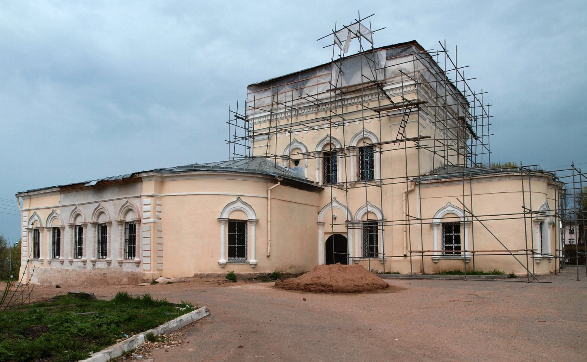 Реставрационные работы, ведущиеся на момент съёмки, являются важным этапом в жизни этой святыни. Установленные строительные леса позволяют специалистам провести комплекс работ по укреплению конструкций, восстановлению фасадной штукатурки и декора, а также реконструкции кровли и купольного покрытия. На переднем плане фотографии видна насыпь из строительных материалов, что свидетельствует о активной фазе восстановления.