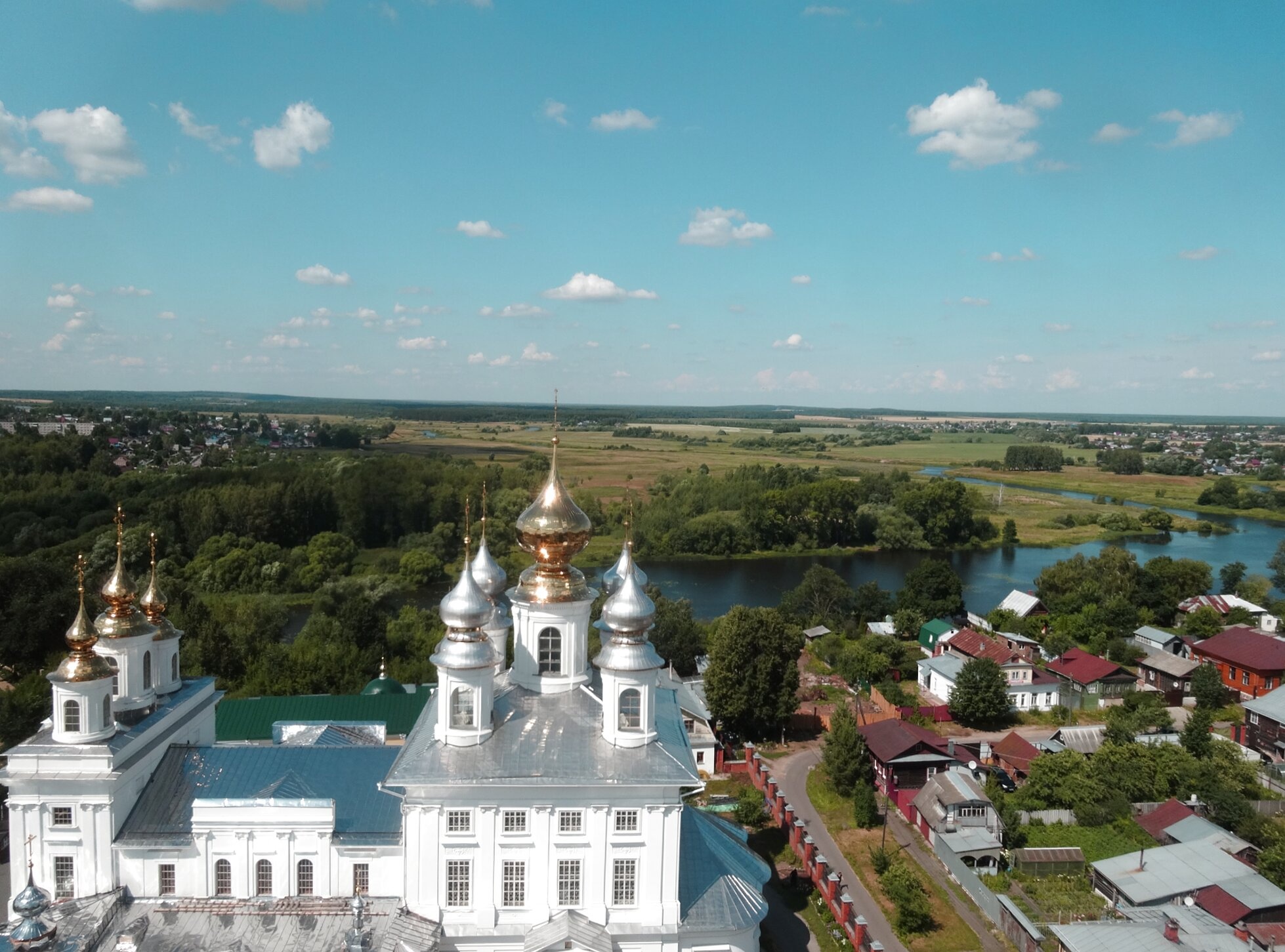 На представленной фотографии запечатлён величественный Воскресенский собор, являющийся архитектурной доминантой и духовным сердцем древнего города Шуя. Панорамный снимок сделан предположительно с знаменитой Шуйской колокольни, которая славится на всю Россию своим высоким и стройным силуэтом. Белоснежный храм с сияющими на солнце золочёными куполами и серебряными главками гордо возвышается над исторической частью города, демонстрируя совершенство своих пропорций и благолепие.