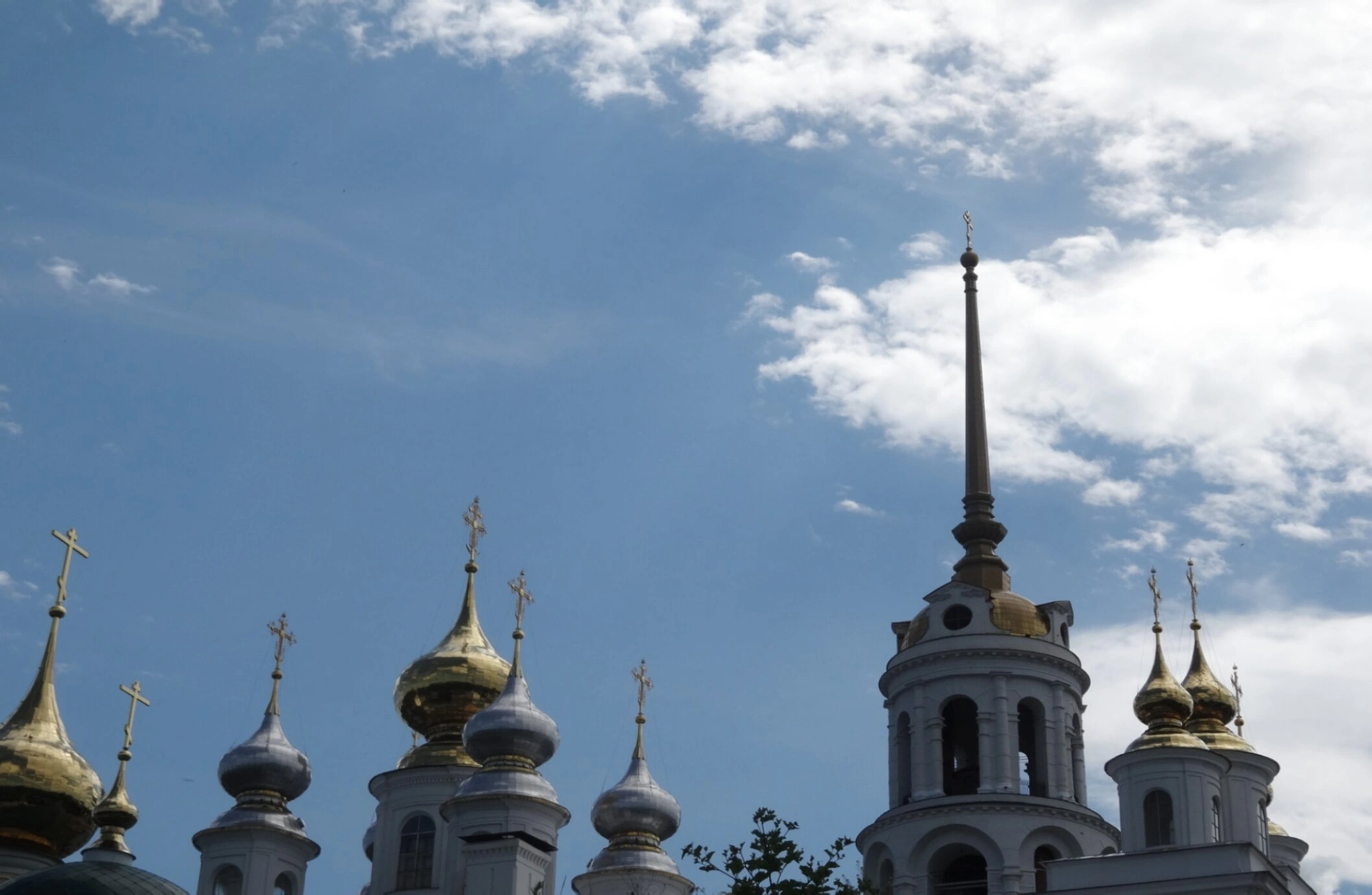 Под небесами сияют на солнце маковки глав самого собора. Позолоченные купола, установленные на изящные световые барабаны, символизируют небесную славу и благодать. Их луковичная форма традиционна для русского православного храмостроения. Рядом виднеются тёмные купола, возможно, относящиеся к другим пределам или часовням комплекса, создавая гармоничный контраст.