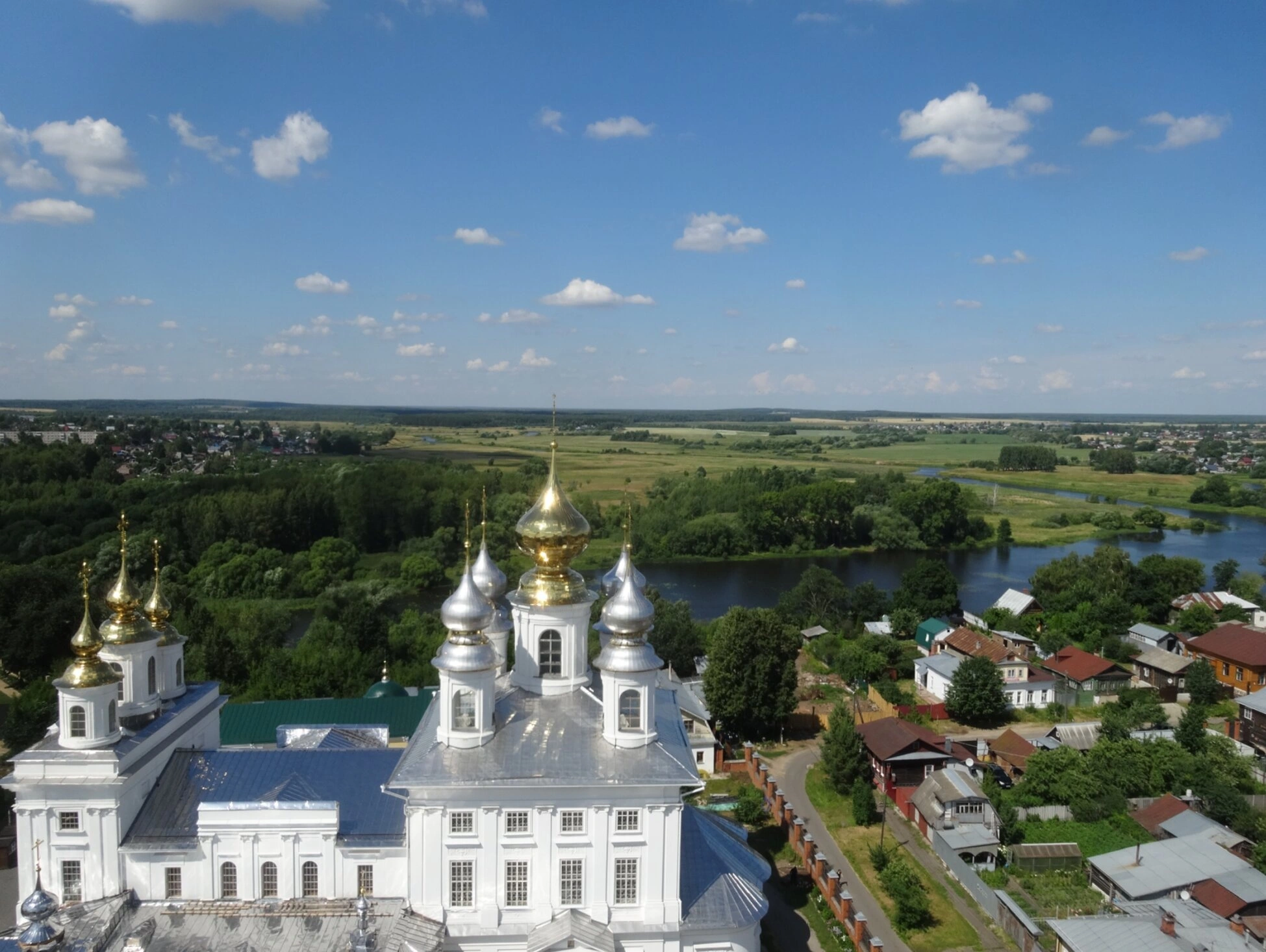 На представленной фотографии запечатлён вид на Воскресенский кафедральный собор города Шуи Ивановской области, сделанный с высоты его знаменитой колокольни. Снимок открывает уникальную перспективу, позволяющую оценить монументальность и красоту этого выдающегося православного комплекса, являющегося архитектурной доминантой и духовным сердцем древнего города.