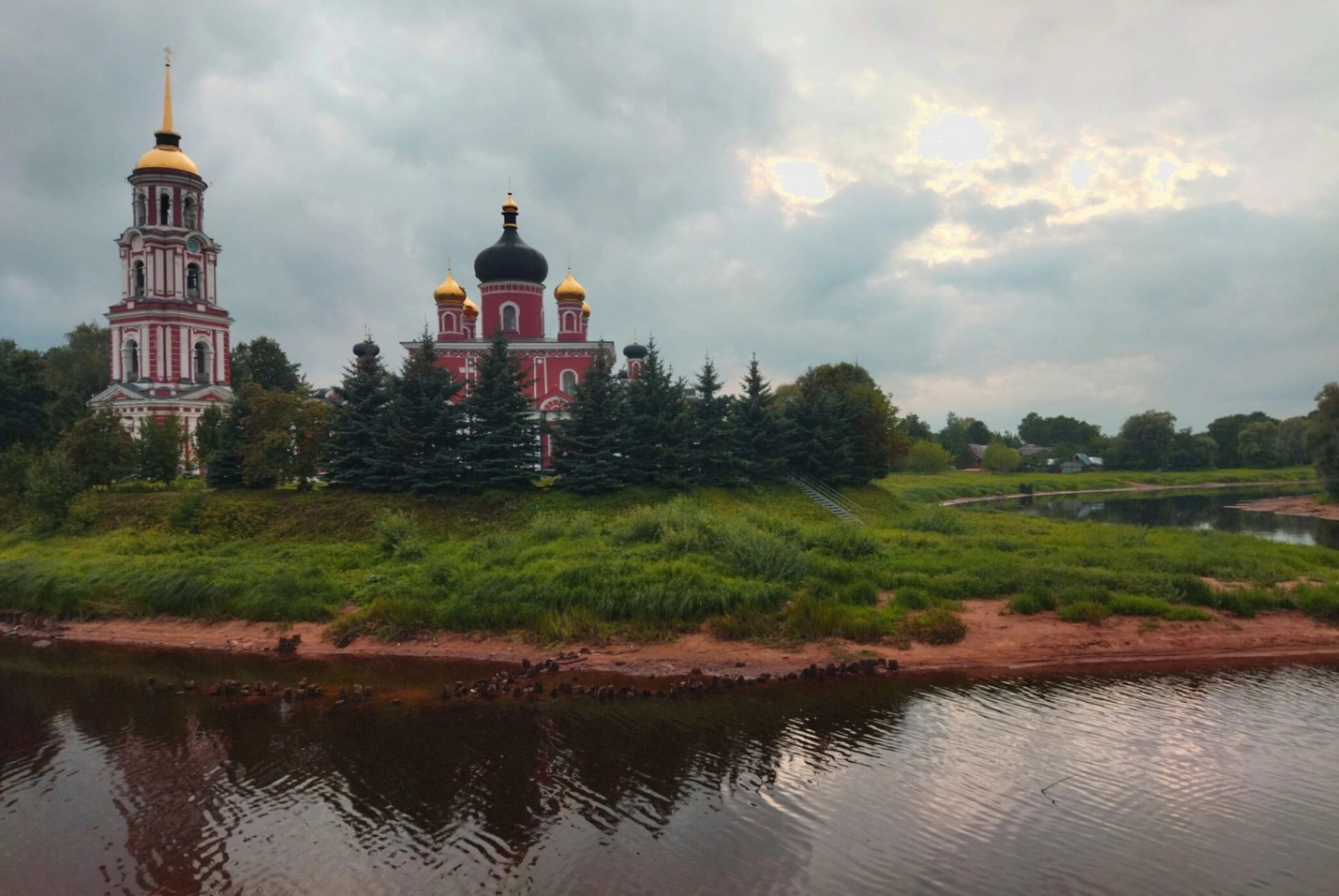 На представленной фотографии запечатлён величественный ансамбль Воскресенского собора, стоящего на стрелке рек Полисти и Перерытицы в древнем городе Старая Русса. Этот действующий православный храм, освящённый в честь Светлого Христова Воскресения, является одной из главных духовных и архитектурных доминант города.