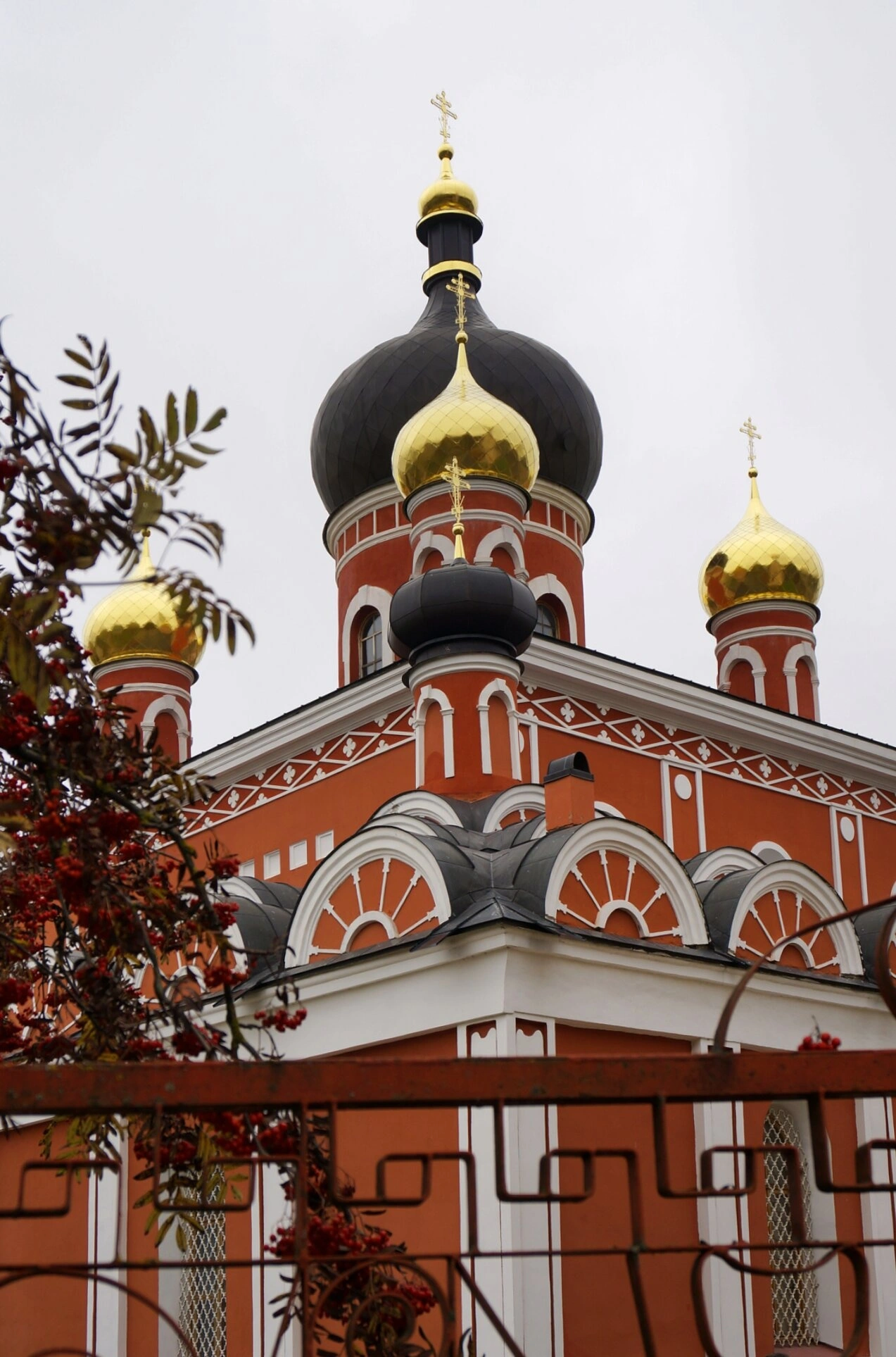 На переднем плане снимка видны ветви дерева с алыми ягодами, обрамляющие собор с южной стороны, а также фрагмент чугунной ограды, окружающей храмовую территорию. Фотография передаёт не только архитектурные особенности, но и духовную атмосферу этого намоленного места, которое на протяжении нескольких столетий является центром православной жизни города.