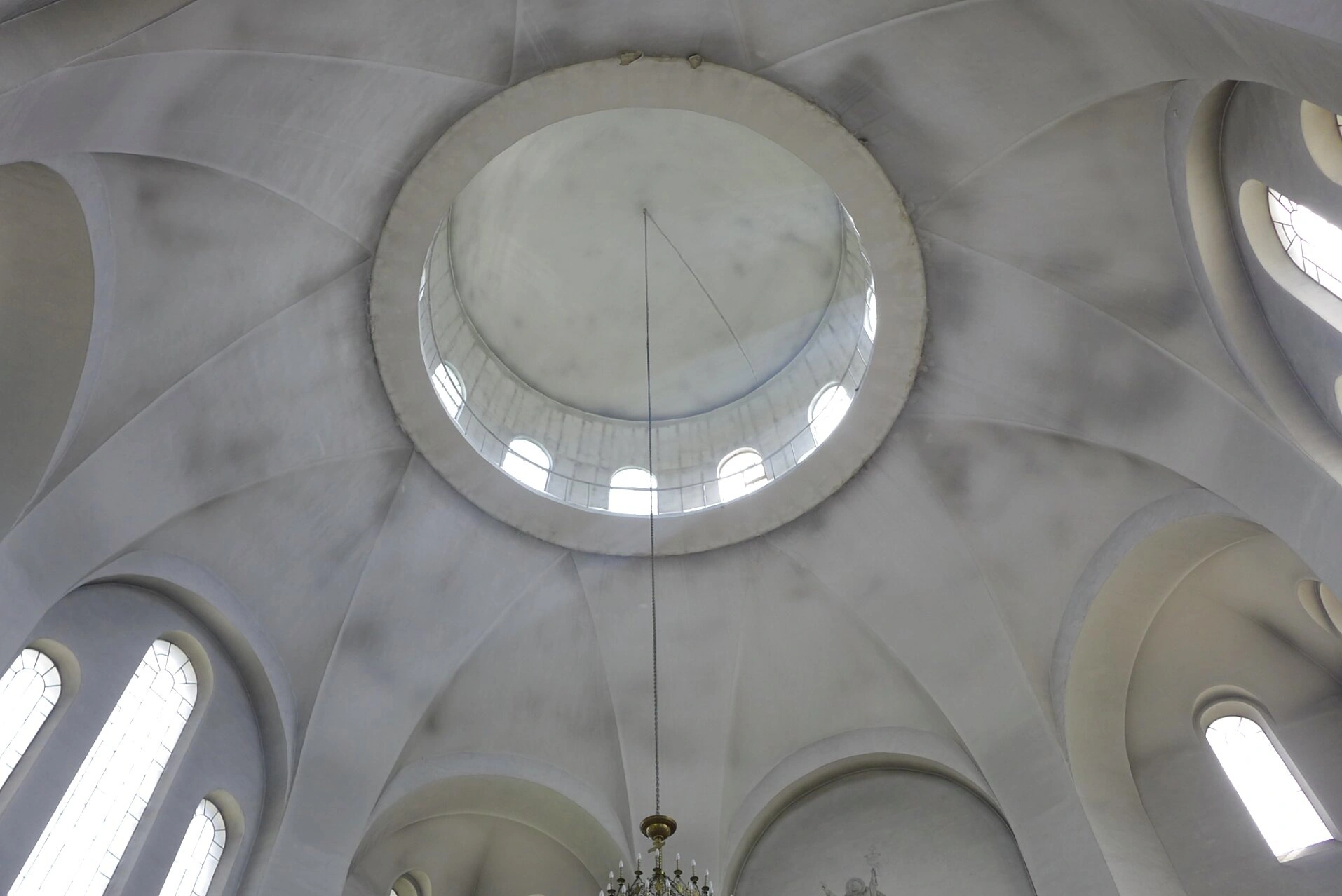 Белоснежные стены собора, символизирующие духовную чистоту и благодать, эффектно контрастируют с глубоким цветом куполов, увенчанных златоглавыми крестами. Арочные оконные проемы, характерные для церковного зодчества, наполняют внутреннее пространство храма божественным светом. На фотографии также видны рабочие лестницы, что свидетельствует о непрестанных трудах по сохранению и поддержанию святой обители.