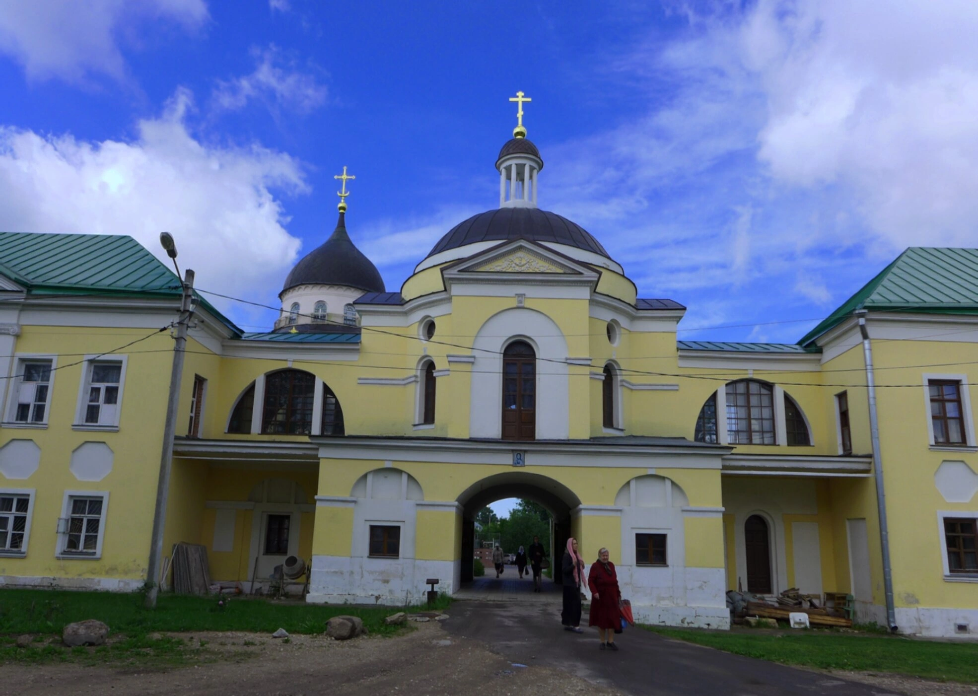 На переднем плане фотографии, у входа, запечатлены две фигуры в тёмных одеждах, предположительно насельницы монастыря. Их присутствие оживляет кадр и подчёркивает предназначение этого места как центра монашеской жизни и молитвенного подвига.