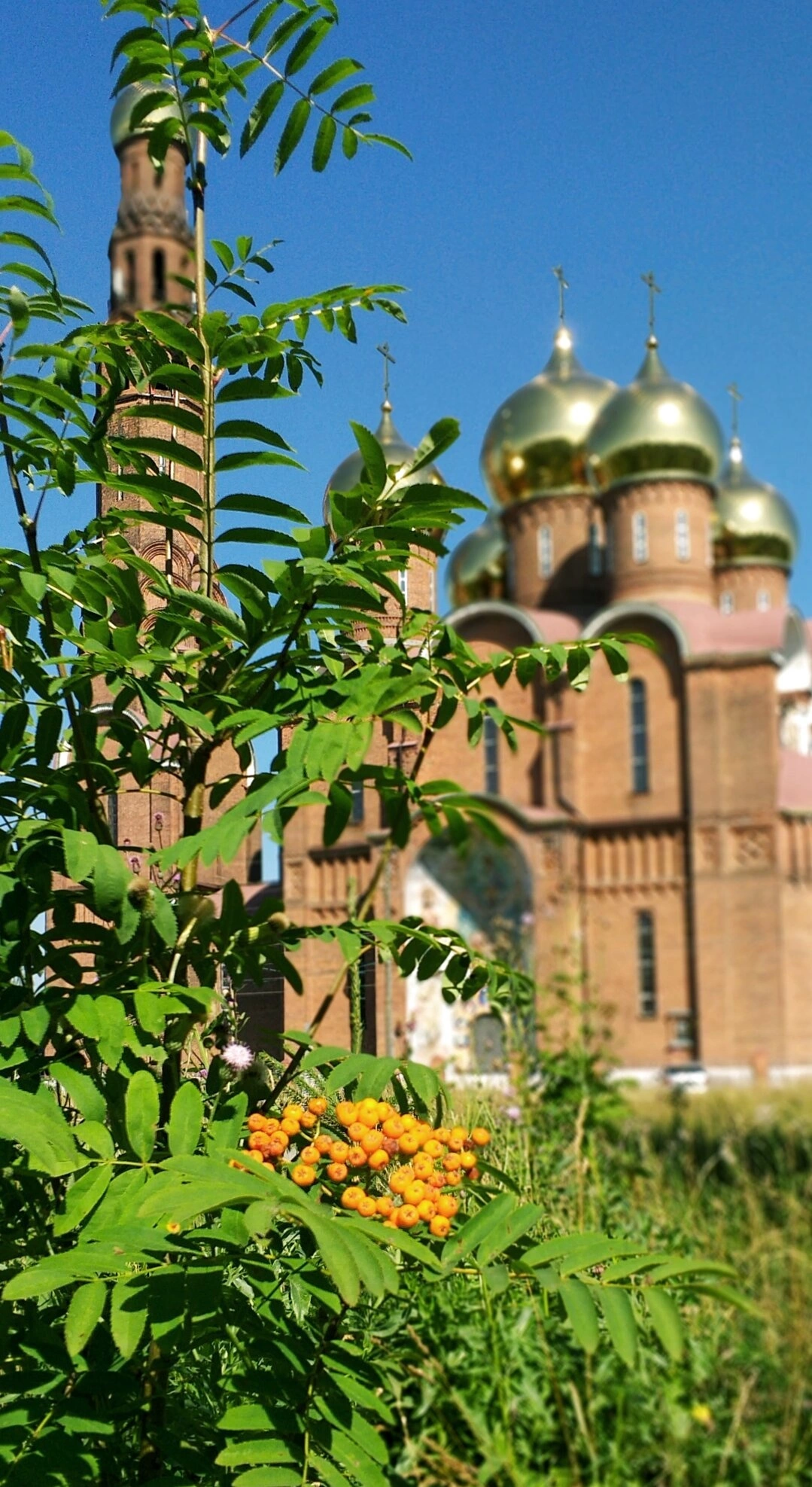 На переднем плане снимка живописно расположилась ветвь рябины с алыми ягодами, символизирующая в православной традиции красоту Божьего творения и светлую надежду. Сквозь её листву открывается вид на монументальное краснокирпичное здание собора, устремлённое ввысь. Пять золочёных глав, сияющих под лучами солнца на фоне безмятежного голубого неба, создают возвышенный и благоговейный образ.