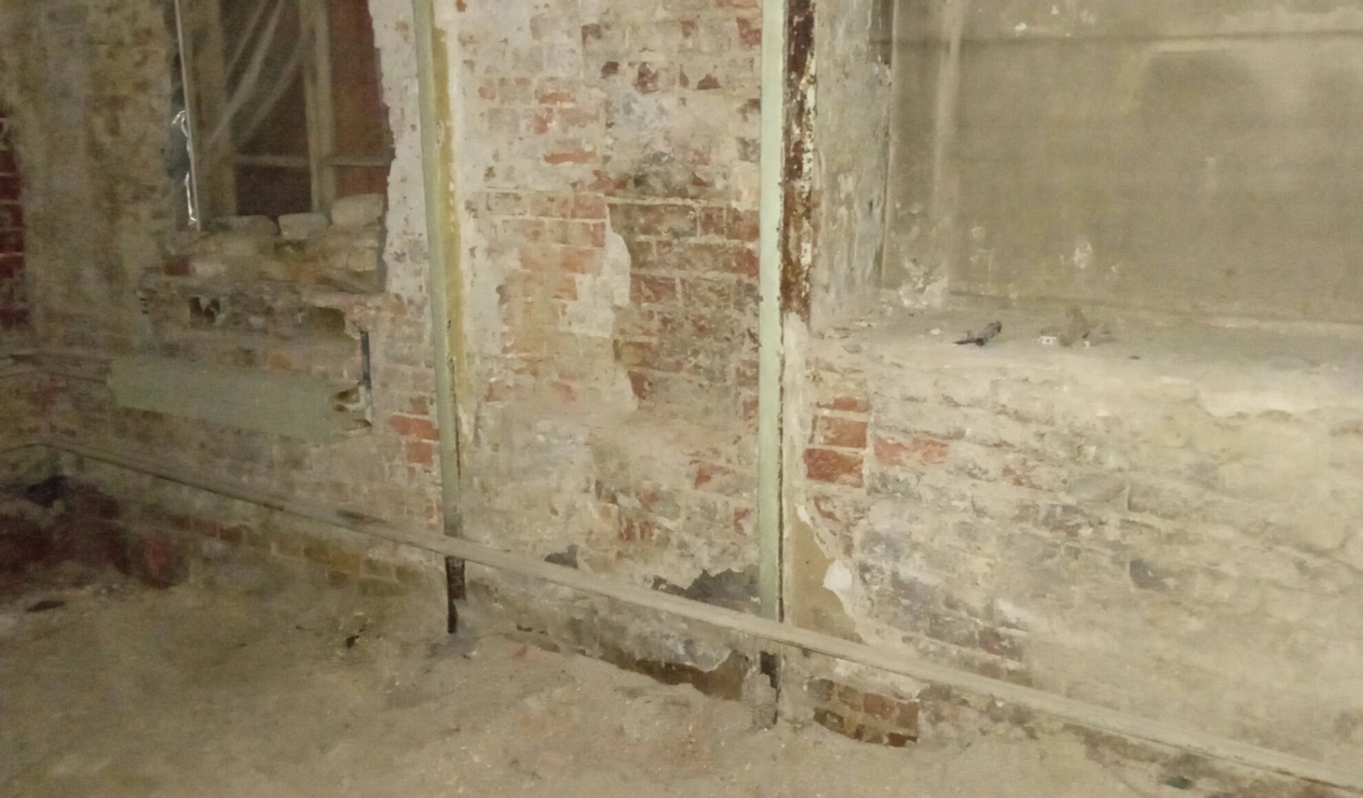 Внутреннее пространство храма демонстрирует кирпичную кладку, частично освобожденную от старой штукатурки, что является необходимым этапом реставрационного процесса. На стенах видны следы времени, требующие внимательного отношения и профессионального вмешательства реставраторов.