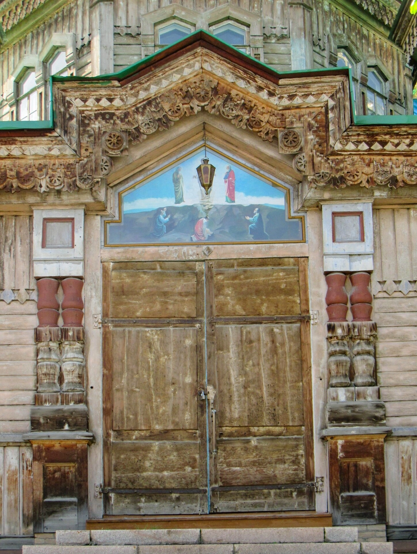 На фотографии запечатлены восточные входные врата Свято-Троицкой православной церкви, находящейся в городе Каракол (Кыргызстан). Этот уникальный деревянный храм, возведённый в XIX веке без использования единого железного гвоздя, является выдающимся памятником русского церковного зодчества в Центральной Азии.