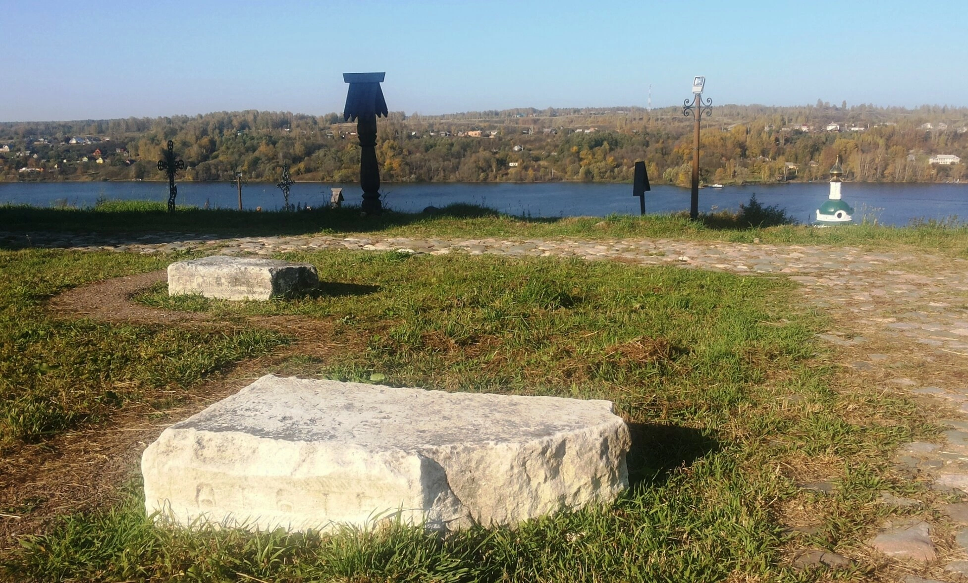 На переднем плане изображено старинное кладбище, где сохранились деревянные поклонные кресты и намогильные столбики, один из которых увенчан синей главкой – традиционный элемент православной погребальной культуры. Через ухоженную территорию ведет узкая тропинка, ведущая к храму и водной глади.