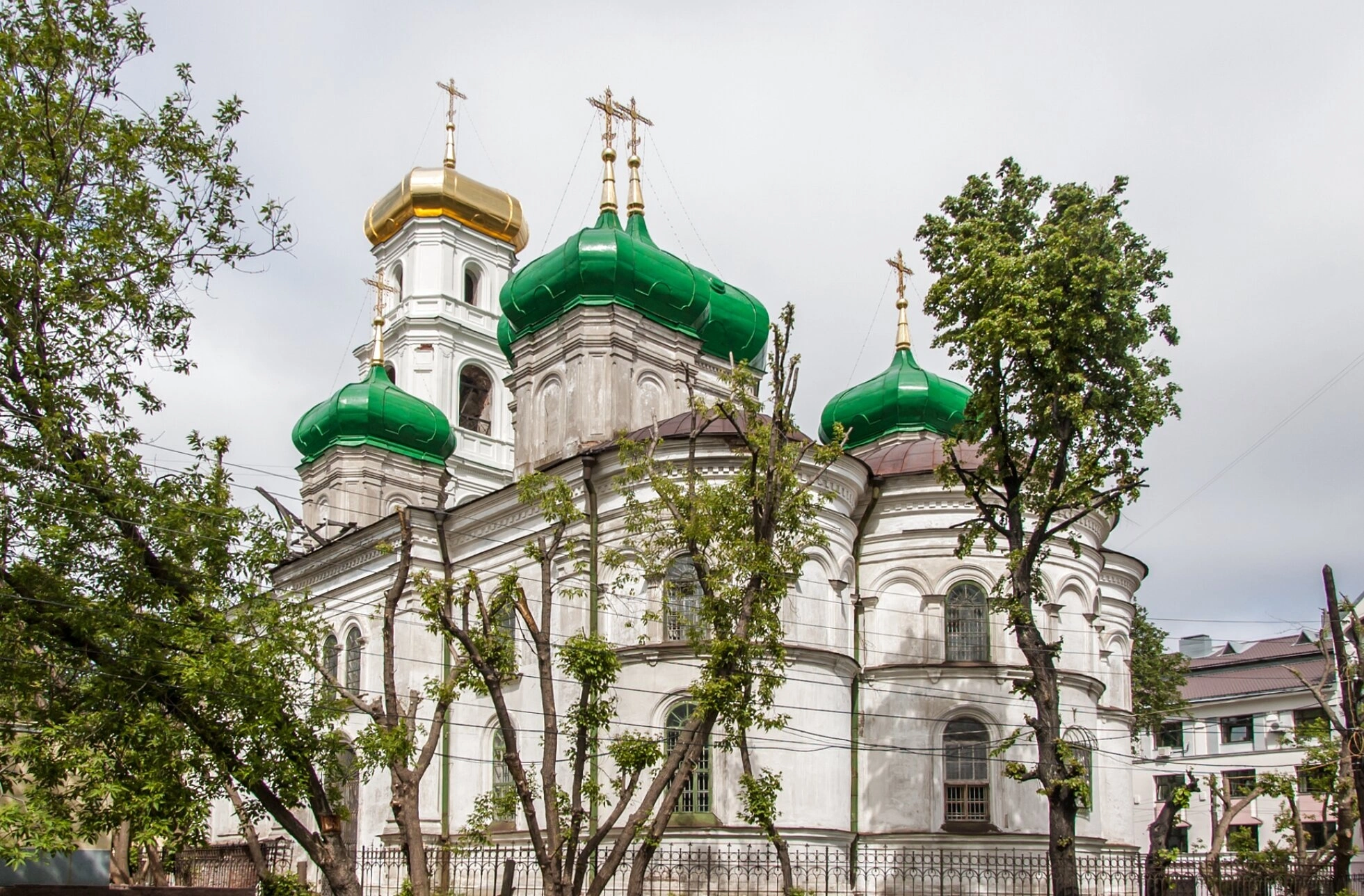 На фотографии запечатлена величественная Вознесенская церковь, что располагается на улице Ильинской в историческом центре Нижнего Новгорода. Этот православный храм, освящённый в честь Вознесения Господня, является выдающимся памятником церковной архитектуры последней трети XIX века и неотъемлемой частью духовного ландшафта города.