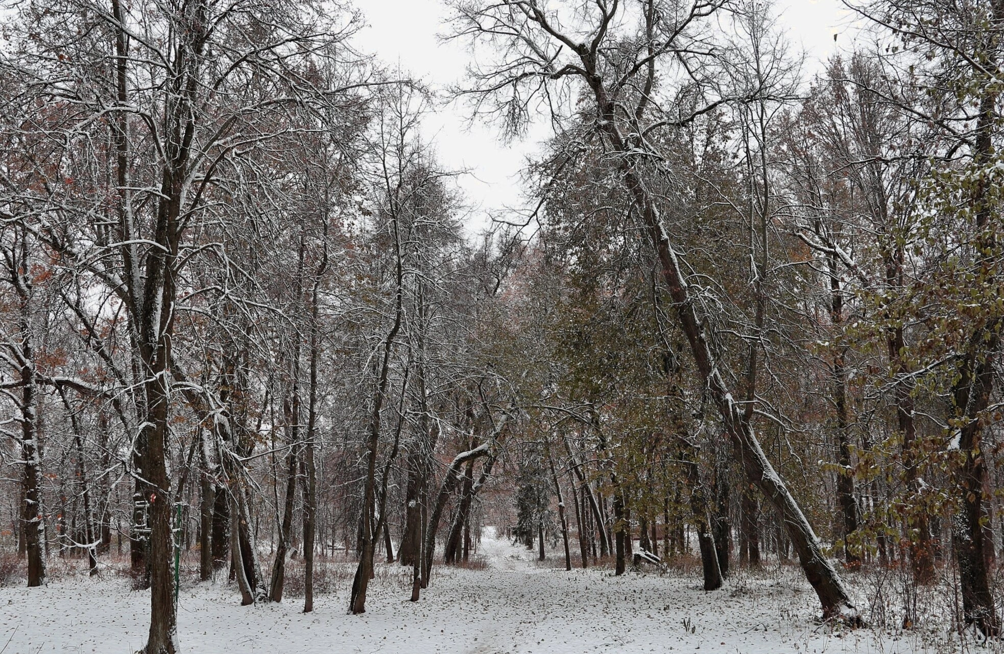 Лесная тропа, укрытая белоснежным покровом, ведет через лиственный лес, деревья которого склонили свои ветви под тяжестью снега. Голые ветви деревьев создают сложный кружевной рисунок на фоне светлого пасмурного неба, характерного для средней полосы России в зимний период. Некоторые деревья сохранили остатки пожелтевшей листвы, что добавляет пейзажу особое очарование уходящей осени.
