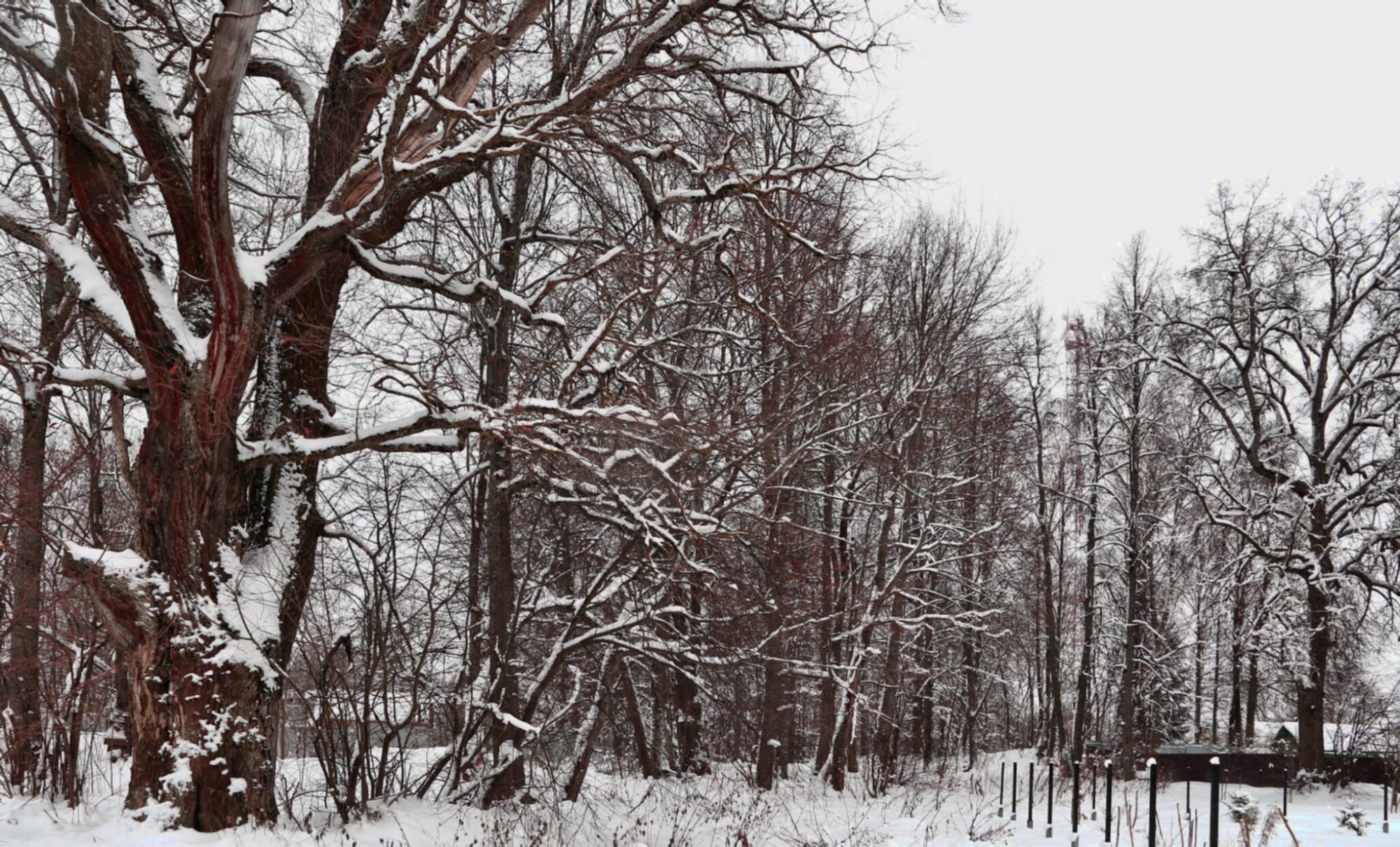 Вознесенская церковь в Красном - зимний пейзаж с храмом и парком усадьбы
