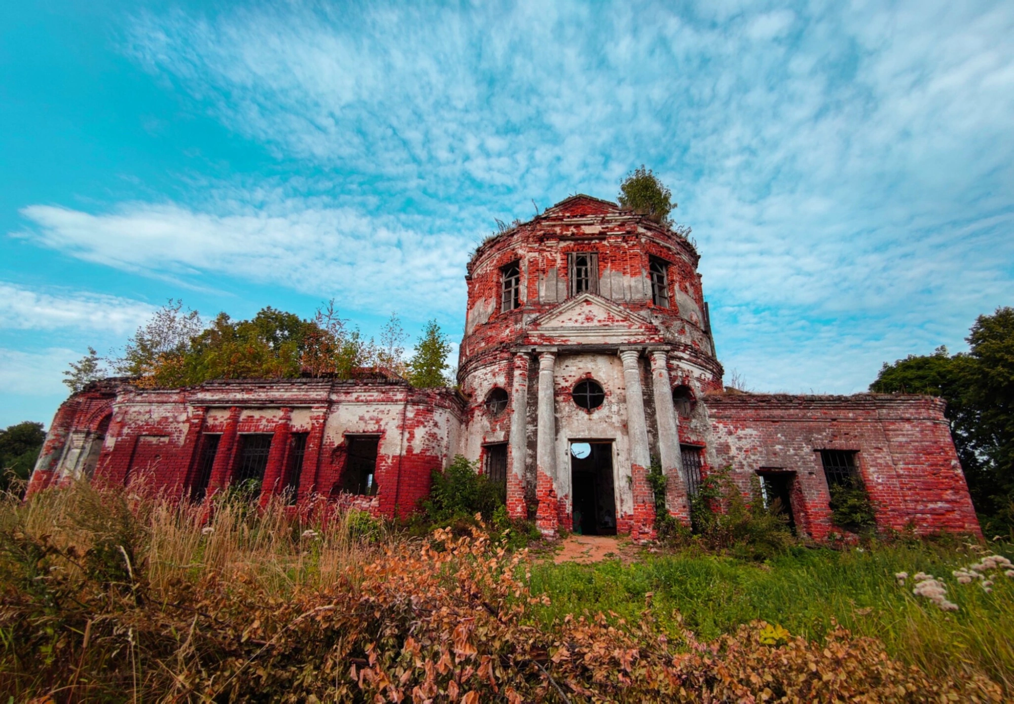 На представленной фотографии запечатлена заброшенная Вознесенская церковь, расположенная в селе Красное Владимирской области. Этот православный храм был возведён в 1789 году и освящён в честь Вознесения Господня.
