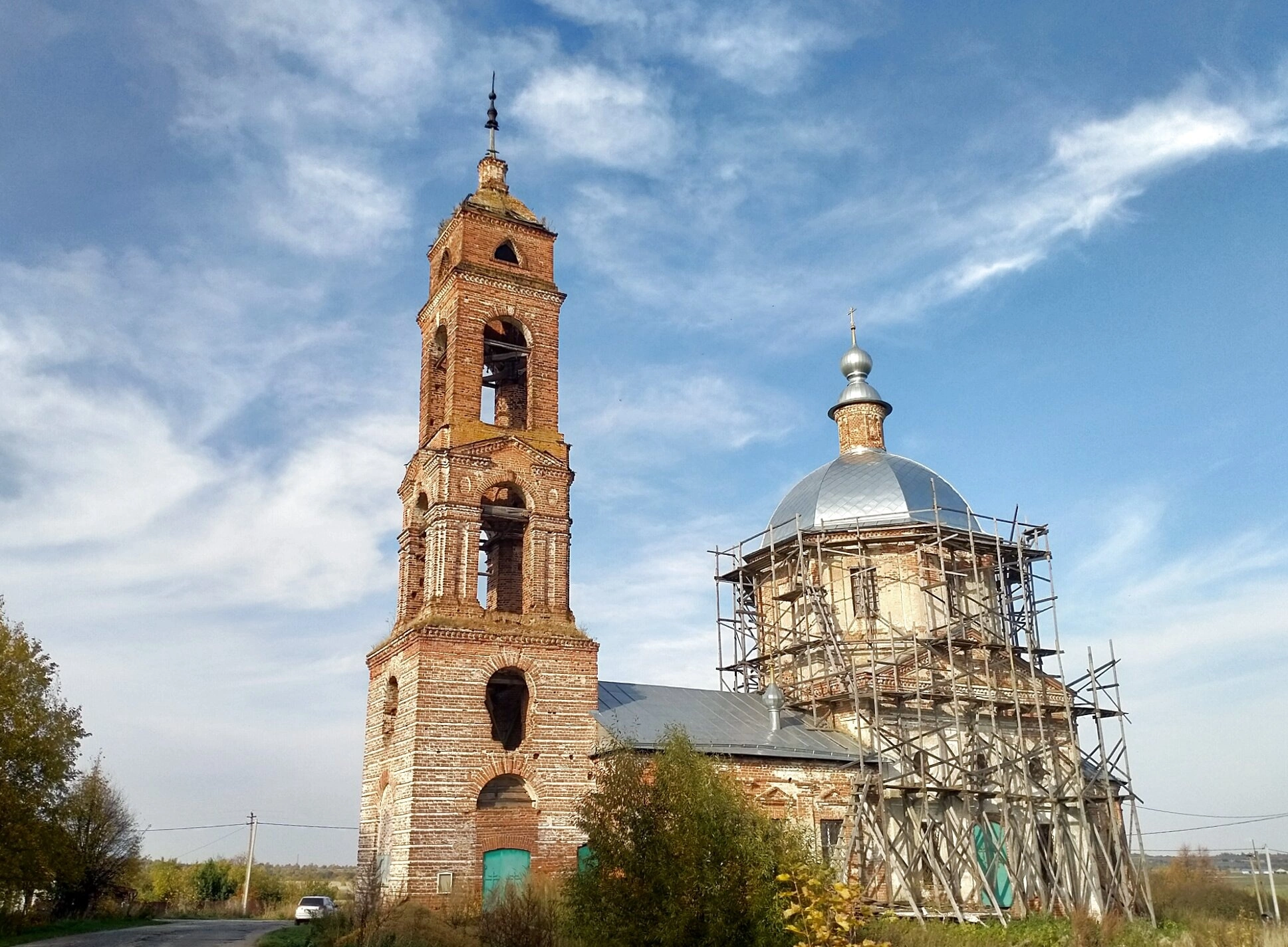 В настоящее время храм находится в процессе реставрационных работ, о чем свидетельствуют строительные леса, установленные вокруг центральной части с куполом. Это говорит о заботе о сохранении духовного наследия и восстановлении исторического облика святыни. Окружающий пейзаж дополняет осенняя растительность и грунтовая дорога, ведущая к храму, создавая гармоничную картину русского православного ландшафта.