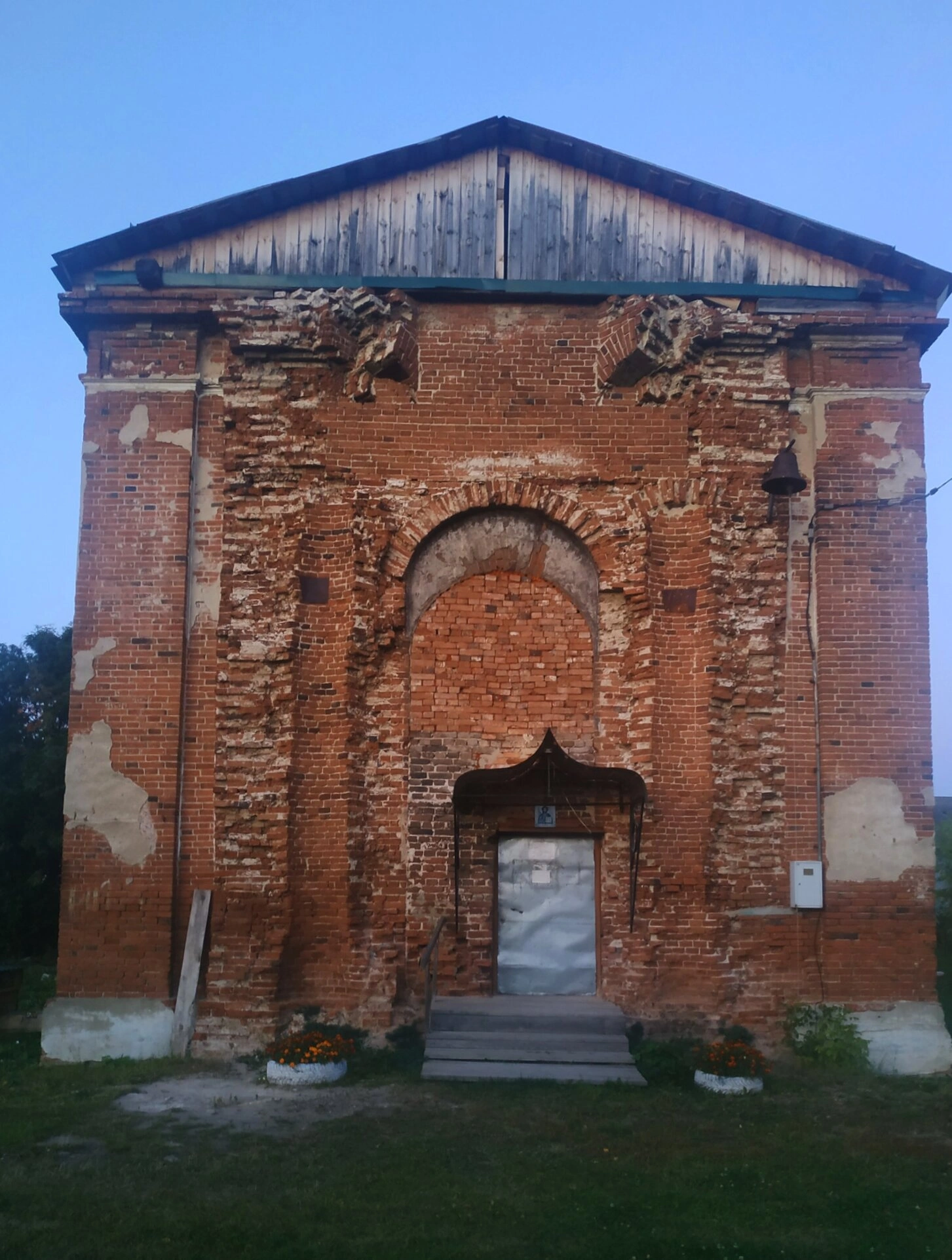 Фасад церкви демонстрирует следы времени: обветшалую кирпичную кладку и утраты архитектурных деталей. Центральный арочный вход, к которому ведут каменные ступени, приглашает внутрь, а по обеим сторонам от него устроены скромные цветочные горшки, что свидетельствует о попытках сохранения памяти о святом месте. Деревянная кровля, пережившая немало непогод, завершает архитектурный облик.