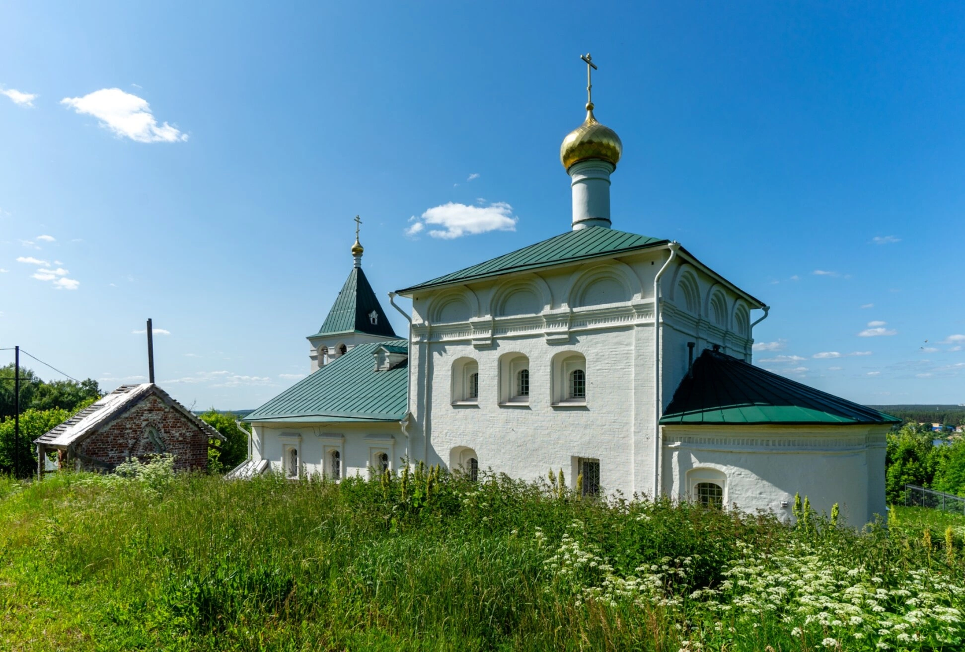 Храм, увенчанный златым куполом с вознесенным крестом, сияет под лучами летнего солнца. Зеленые кровли гармонично сочетаются с окружающей природой, создавая образ небесной красоты и земного благолепия. Пышная трава и полевые цветы, окружающие святыню, дополняют благостную картину святого места, придавая ей особое духовное звучание.
