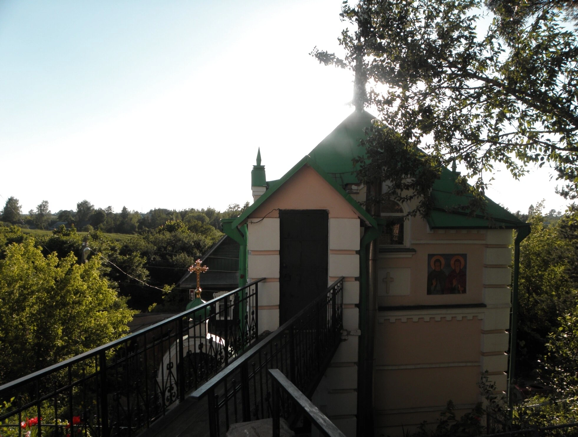 К главному входу ведёт каменная лестница с изящными коваными перилами, приглашая верующих и паломников на молитву. На фасаде здания размещена икона, от которой веет благоговением и святостью. Яркий солнечный свет озаряет храм, играя бликами на его стенах и создавая божественную атмосферу умиротворения. Пышная зелёная растительность, окружающая церковь, гармонично дополняет образ, делая его по-настоящему одухотворённым.