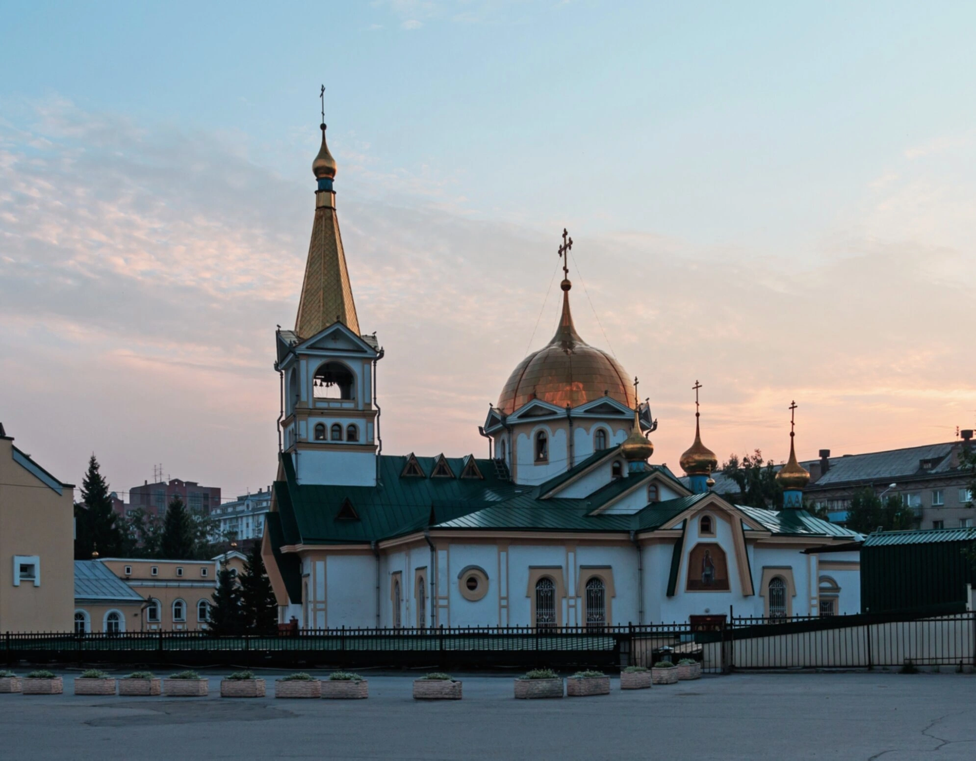 На представленной фотографии запечатлён величественный Вознесенский кафедральный собор, являющийся главным православным храмом Новосибирска. Его золочёные купола, сияющие под небом Сибири, и стройная колокольня представляют собой классический образец русской церковной архитектуры, создавая впечатление незыблемости и духовного величия.