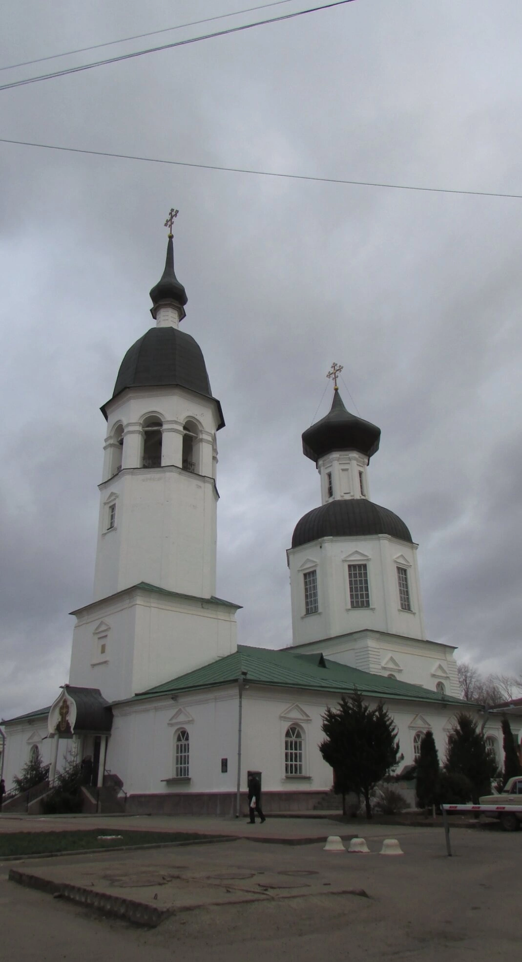 Вокруг собора видна благоустроенная территория с зелёными насаждениями, что создаёт атмосферу благоговения и покоя. В пасмурный день, запечатлённый на снимке, архитектурный ансамбль выглядит особенно одухотворённо и монументально, напоминая о вечных ценностях и небесном заступничестве. Вознесенский собор является не только памятником архитектуры, но и действующей святыней, куда ежедневно приходят верующие для молитвы.