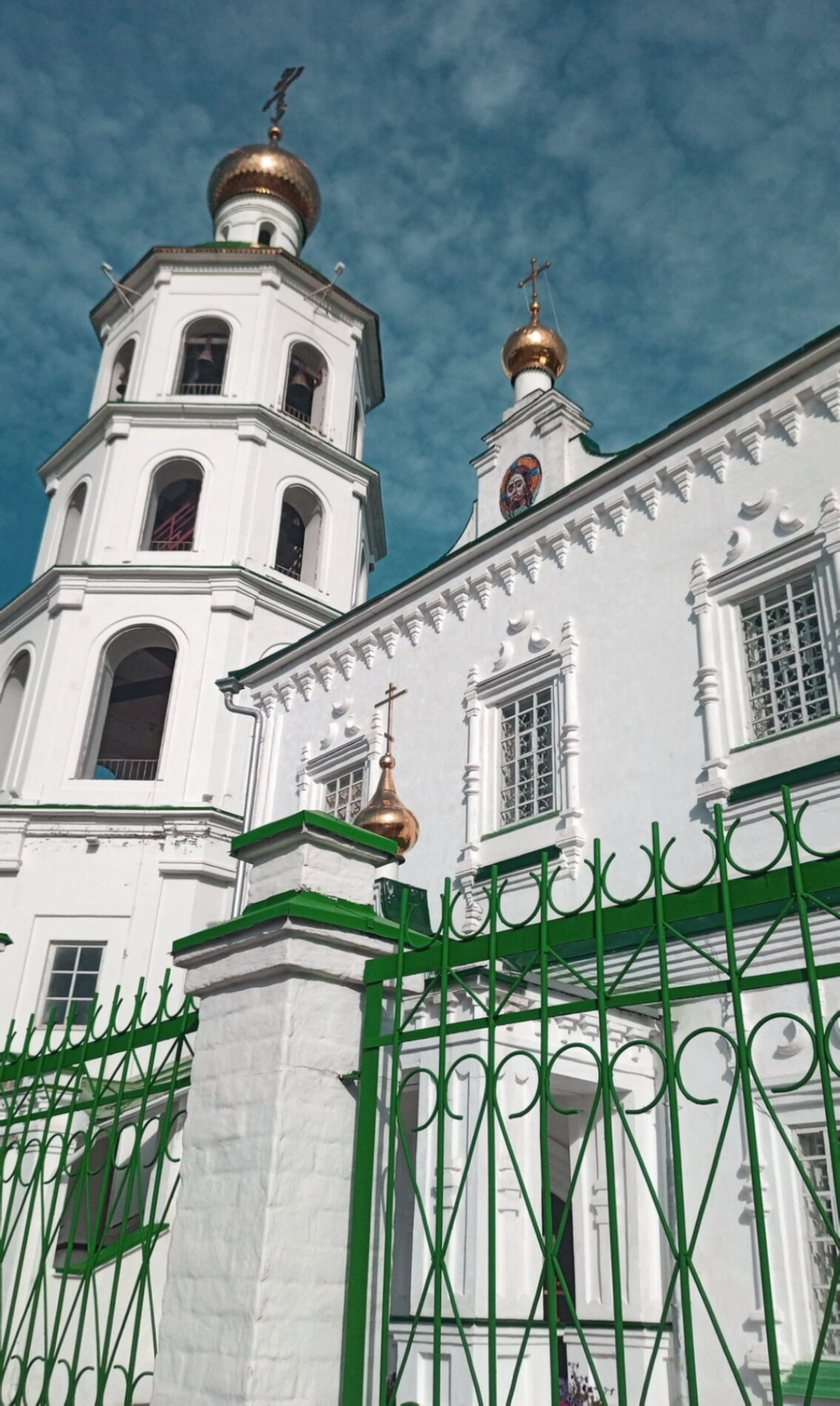 Белоснежные стены собора символизируют чистоту и духовное преображение, а устремлённые ввысь золочёные купола, увенчанные православными крестами, ярко сияют под лучами солнца. Изумрудные кровли храма гармонично дополняют его светлый облик. На переднем плане фотографии видна аккуратная литая ограда, подчёркивающая благолепие всего церковного комплекса.