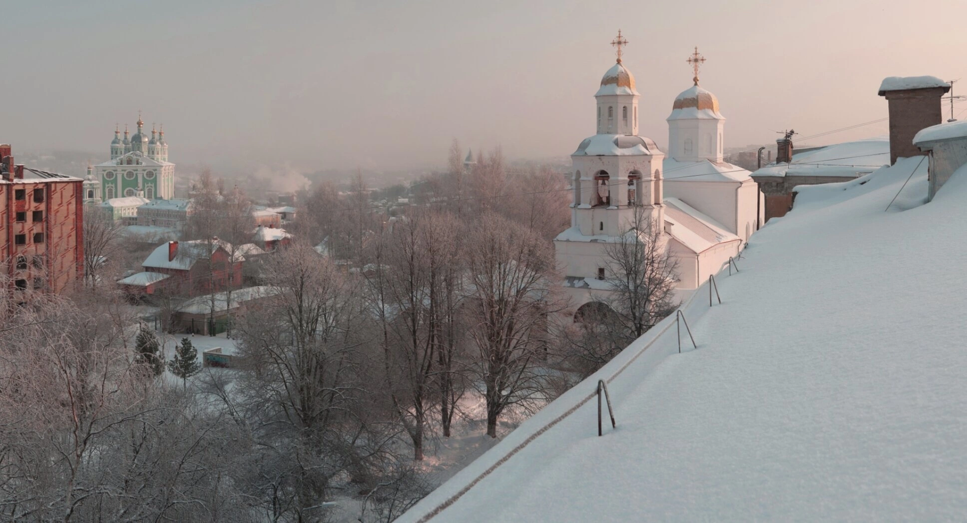 На переднем плане изображения виден склон крыши, обильно покрытый пушистым снегом, с чёткими металлическими ограждениями. Центральное место в композиции занимает ослепительно белый храм с двумя златоглавыми куполами, увенчанными православными крестами, и высокой колокольней, устремлённой в небесную высь. Слева на заднем плане располагается ещё одна церковь, окрашенная в благородный бирюзовый цвет, также украшенная золотыми куполами, сияющими даже в рассеянном зимнем свете.