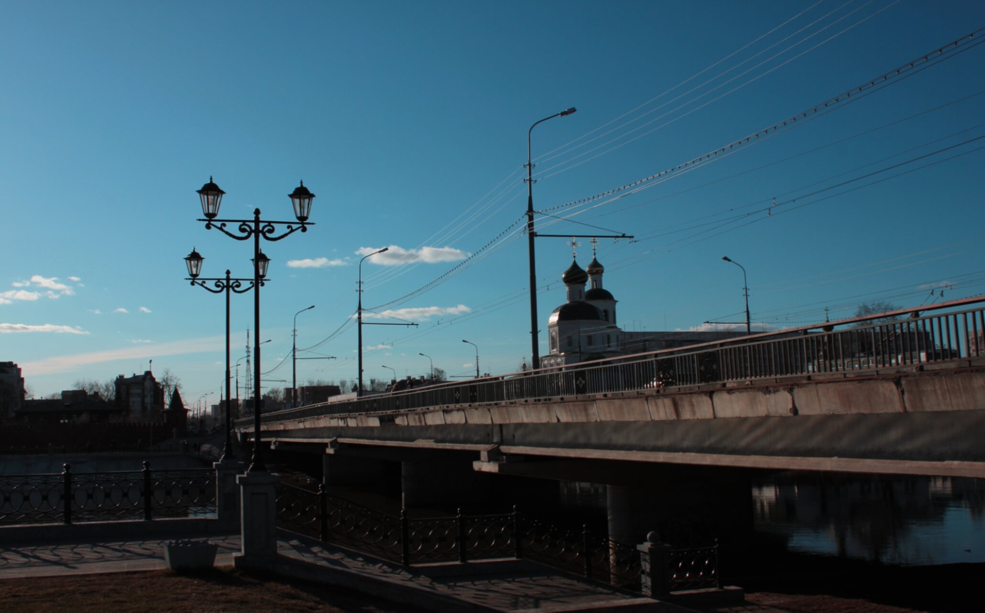 По обеим сторонам моста и на благоустроенной набережной установлены изящные декоративные фонари, которые в вечернее время суток подсвечивают архитектуру и создают особую атмосферу. Спокойная гладь реки отражает лазурное небо с легкими облаками, добавляя изображению умиротворения и гармонии. Данный вид представляет собой один из узнаваемых и символичных образов Йошкар-Олы, где переплетаются современная городская инфраструктура и глубокие православные традиции.