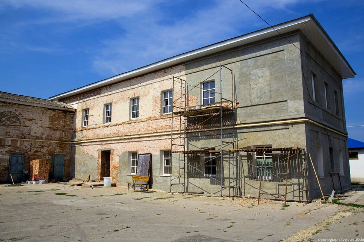 На снимке монастырь зафиксирован в период проведения масштабных реставрационных работ, о чём красноречиво свидетельствуют установленные строительные леса. Часть фасада здания уже оштукатурена и приобрела благолепный серый оттенок, в то время как другая часть ещё сохраняет историческую кирпичную кладку, позволяющую оценить монументальность и древность сооружения. Окна, некоторые из которых облачены в белые рамы, смотрятся симметрично и строго, что характерно для традиционного монастырского зодчества.