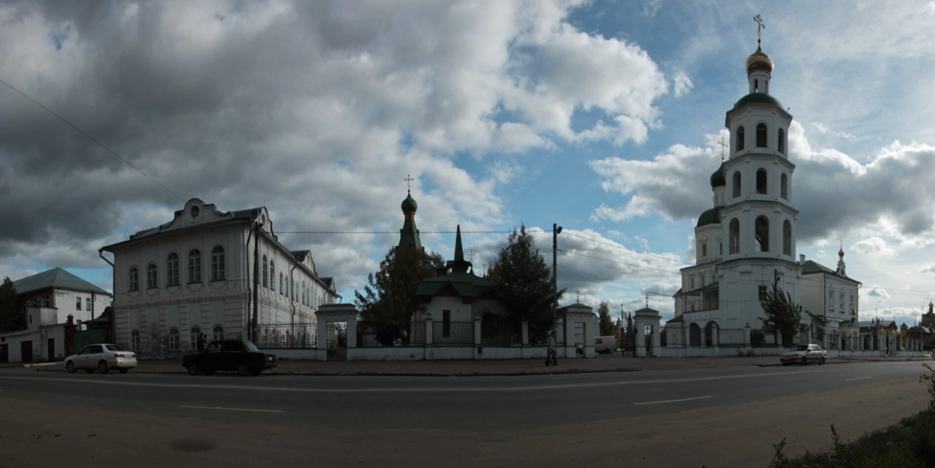 Соборный комплекс гармонично вписан в городской ландшафт столицы Республики Марий Эл. На снимке также видны другие здания, относящиеся к церковным нуждам, и оживлённая улица, что подчёркивает неразрывную связь духовной жизни с повседневным бытием города. Зелёные насаждения вокруг добавляют месту умиротворения и благолепия.