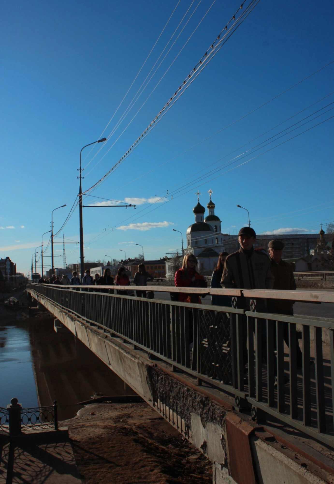 На переднем плане изображен пешеходный мост, по которому движутся люди. Справа видна часть ажурного металлического ограждения, характерного для городского благоустройства. За мостом возвышается величественный Вознесенский собор — один из духовных центров Йошкар-Олы. Храм представляет собой выдающийся образец церковной архитектуры с двумя луковичными главами и высокой колокольней.