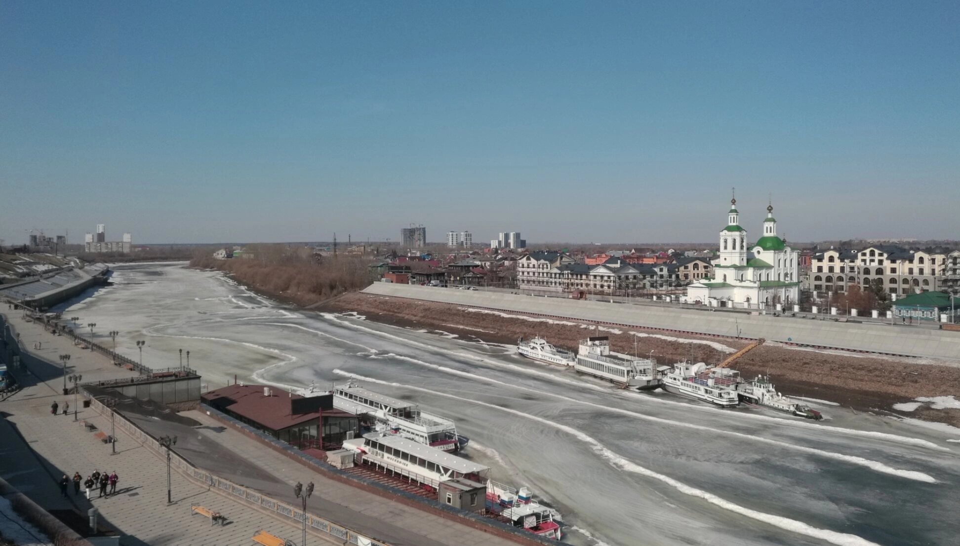 Река Тура на снимке частично покрыта льдом и снегом, что указывает на раннюю весну. Видны участки открытой воды и трещины во льду. По обеим сторонам реки протянулись благоустроенные набережные – излюбленное место прогулок тюменцев. На правом берегу, у самой воды, пришвартованы несколько белых прогулочных теплоходов. На левом берегу обустроена широкая пешеходная зона, где заметны фигуры людей, однако они находятся на значительном расстоянии и не показаны крупным планом.