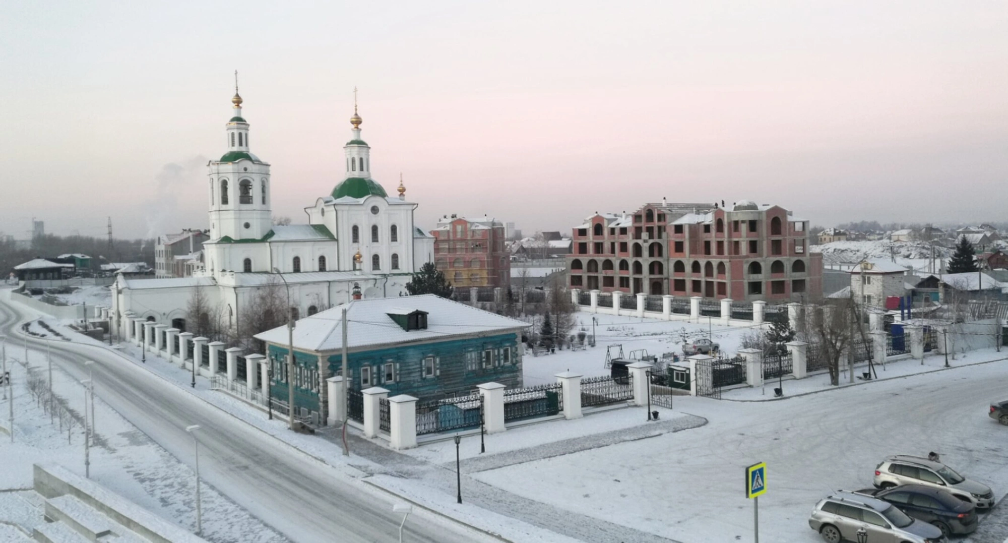 Территория церкви огорожена белым забором с металлическими вставками. Рядом расположено небольшое одноэтажное здание бирюзового цвета с белыми наличниками, также обнесённое кованым ограждением. Справа от храма виднеется строящееся многоэтажное здание из красного кирпича, а вдали — ещё одно жилое строение. Вокруг присутствуют частные деревянные дома, создающие контраст между исторической застройкой и современными постройками.