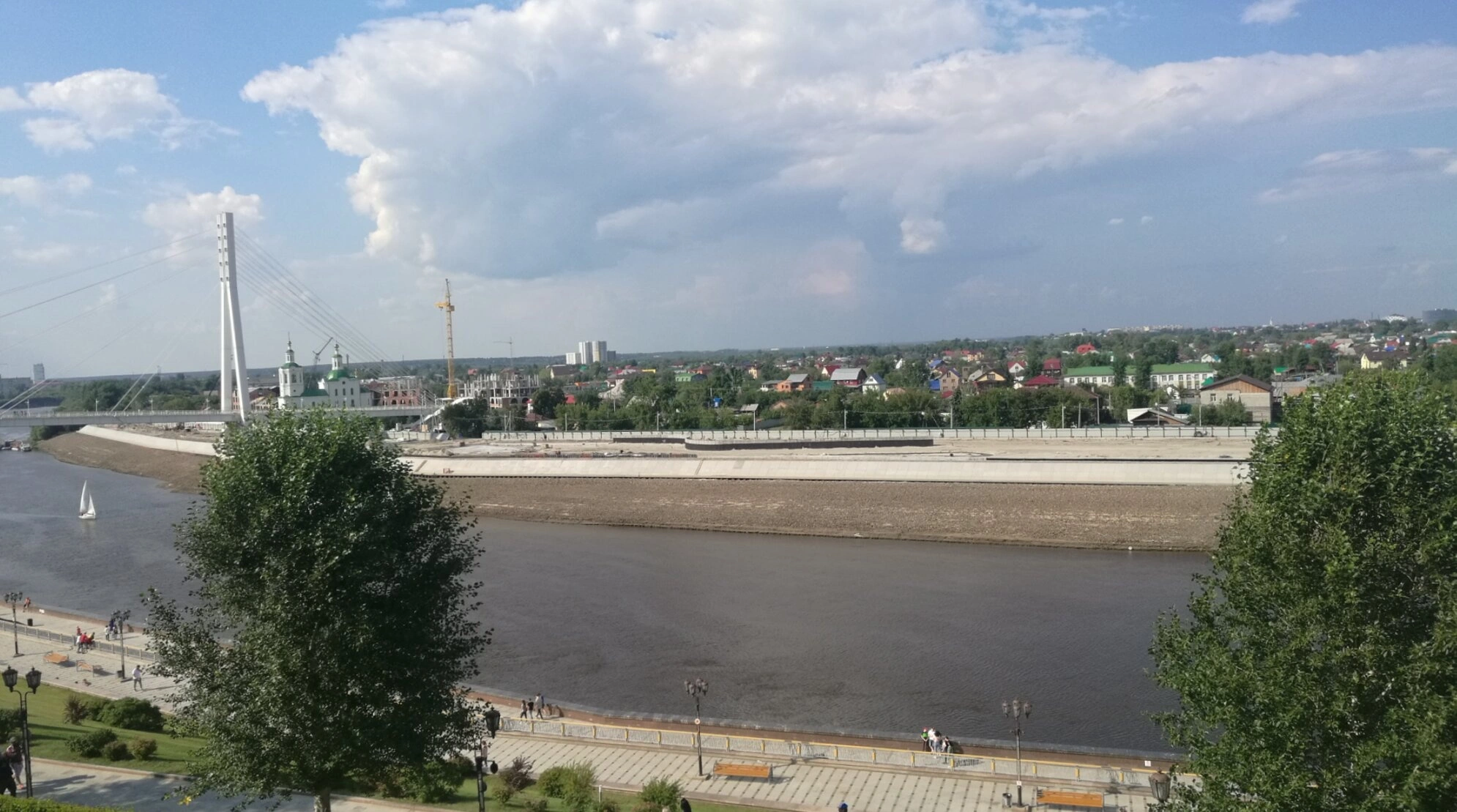 На фотографии запечатлён вид на Вознесенско-Георгиевскую церковь в Тюмени, сделанный с пешеходного Моста Влюбленных. Храм, возведённый в стиле сибирского барокко, возвышается на левом берегу реки Туры. Его белые стены и зелёные купола с крестами отчётливо видны на фоне городской застройки.