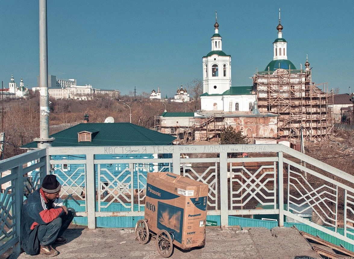 Передний план композиции занимает мост (или смотровая площадка) с белыми металлическими перилами и синими деревянными панелями. У перил слева сидит человек в тёмной одежде и шапке, а рядом находится картонная коробка на небольших колёсиках. На синих панелях видны надписи, выполненные краской.