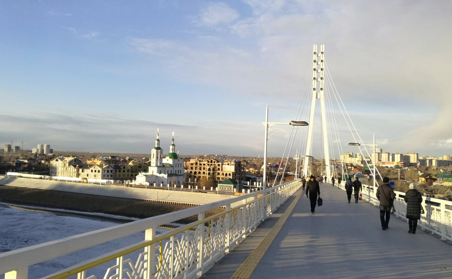 Снимок позволяет оценить удачное расположение церкви на невысоком берегу, её гармоничные пропорции и ярусную композицию. Особую живописность кадру придаёт контраст белых стен храма с яркой зеленью куполов, устремлённых ввысь. Фотография сделана в ясный зимний день, что подчёркивает чистоту линий и детали архитектурного декора. На переднем плане видны элементы вантовой конструкции Моста Влюблённых, который является не только современной достопримечательностью и местом встреч, но и отличной смотровой площадкой. Ракурс раскрывает вид на частично покрытую льдом реку Туру и городскую застройку, простирающуюся за храмом, что позволяет зрителю ощутить масштаб и красоту этого исторического места.