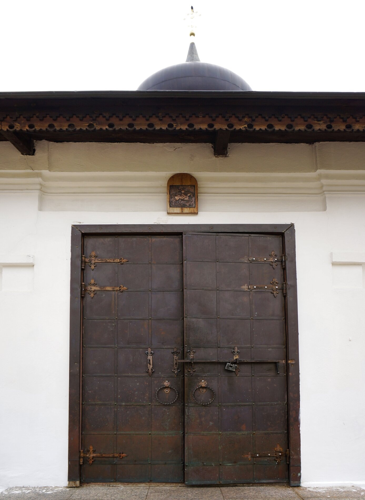Верхнюю часть створок украшают кованые декоративные петли и рукояти, демонстрирующие традиции кузнечного мастерства. На правой створке внимательный взгляд различит висящий замок с длинной дужкой, что говорит о соблюдении порядка и сохранности святыни. Ворота установлены в арочном проёме белоснежной каменной стены, характерной для церковного зодчества.