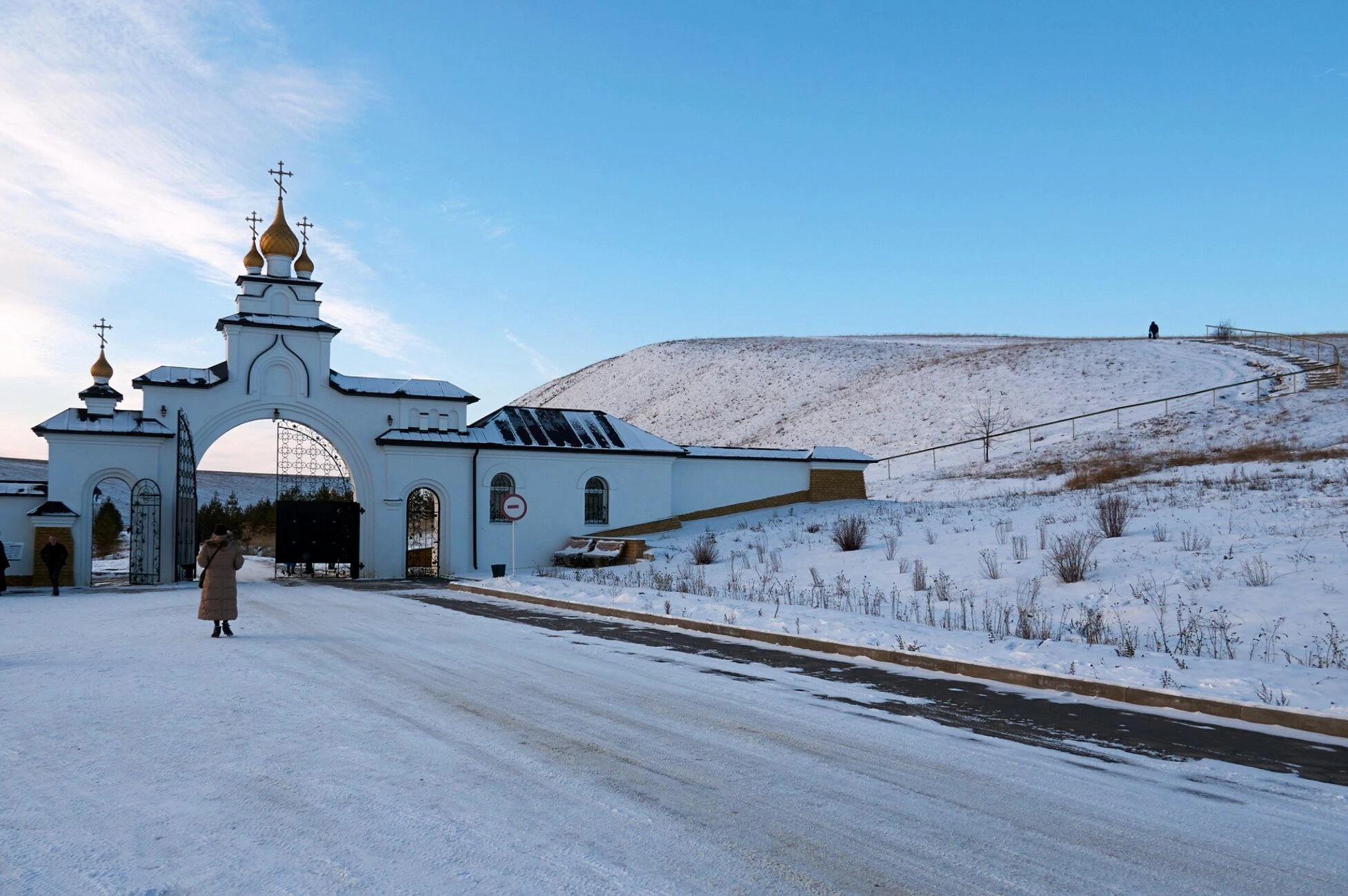 В центре кадра — сами монастырские врата, увенчанные златоглавыми куполами с воздвигнутыми на них крестами, символизирующими спасение и победу жизни над смертью. Белоснежные стены врат гармонируют с чистым снежным покровом, окутавшим священную землю обители. Справа виднеется небольшое одноэтажное здание, вероятно, один из монастырских корпусов, построенных уже в новейшее время для нужд сестер.