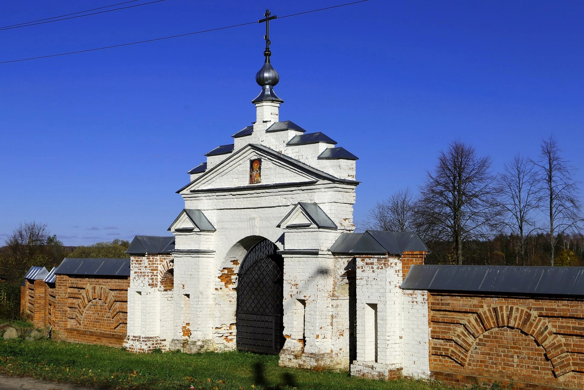 Кирпичная ограда, обрамляющая святые врата, выполнена из красного кирпича и обладает характерными арочными нишами по обе стороны от входа. Нижняя часть конструкции и сами ворота покрыты белой штукатуркой, что создаёт благолепный вид церковной ограды. Несмотря на следы времени, проявляющиеся в некоторой обветшалости кирпичной кладки, сооружение сохраняет своё духовное назначение и архитектурную целостность.