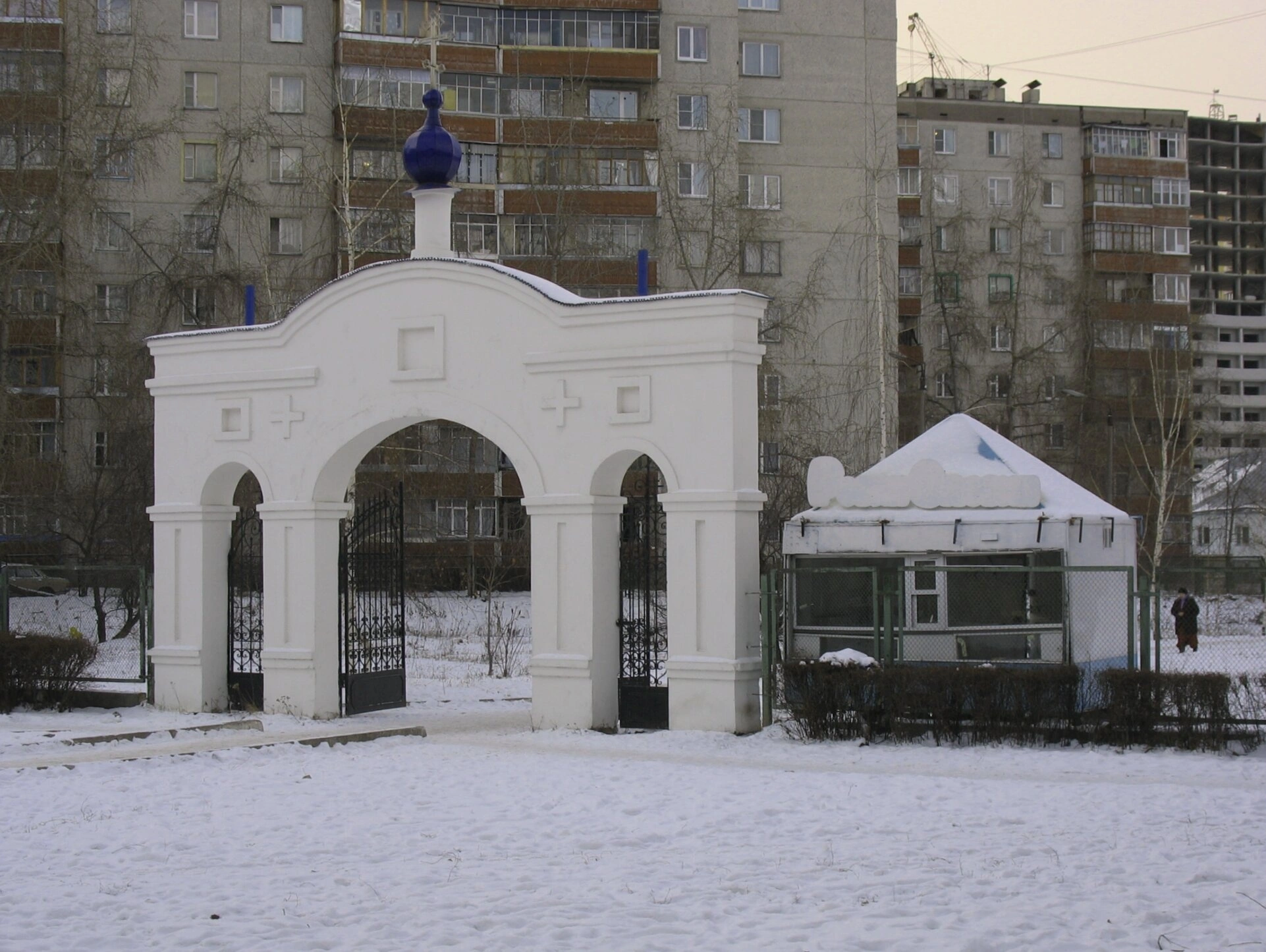 На представленной фотографии запечатлена входная группа Успенского Адмиралтейского храма города Воронежа в зимнее время. Белоснежная арочная конструкция, увенчанная синим куполом и православным крестом, символизирует врата в духовный мир, отделяя мирскую суету от благодати дома Божьего. Под сенью арки размещены ажурные кованые ворота, ведущие на закрытую территорию церковного комплекса.