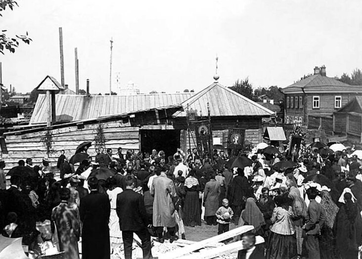 На фотографии изображён значительный момент церковной жизни: вокруг часовни собралось множество благочестивых прихожан. Верующие держат в руках святые иконы и церковные хоругви, что свидетельствует о проведении крестного хода или иного торжественного молебна, возможно, приуроченного к освящению места будущего строительства или к другому важному событию в истории храма. Подобные временные сооружения были распространённой практикой при строительстве крупных каменных церквей, позволявшей не прерывать духовную жизнь общины.