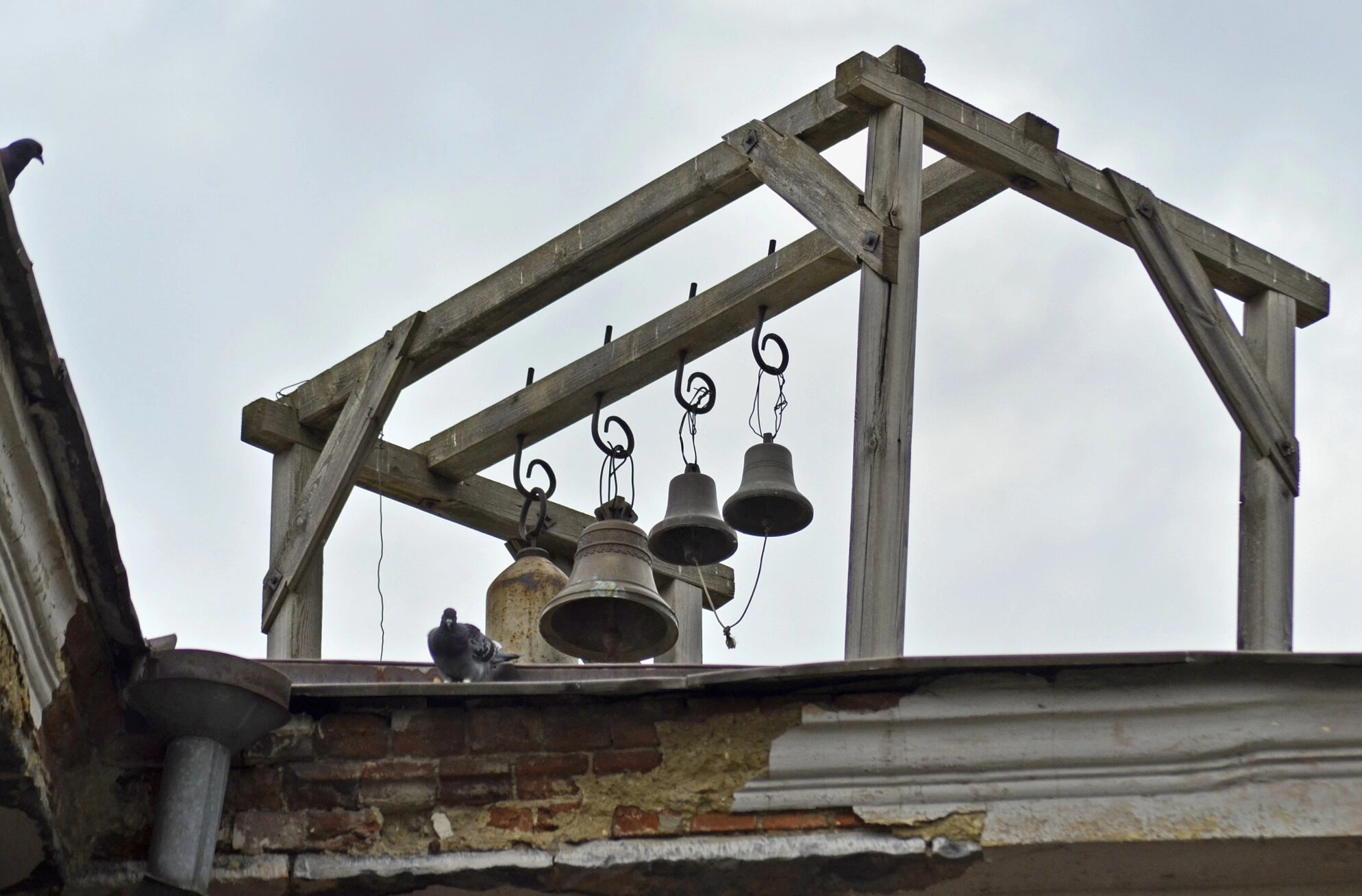Колокола, различающиеся по своему размеру и, следовательно, звучанию, предназначены для совершения различных звонов — благовеста, трезвона, перезвона. Их чистое и благозвучное пение разносилось над старинным уральским городом, освящая его окрестности и вознося молитвы к небу, которое на снимке затянуто облаками, создавая атмосферу величия и благочестия.