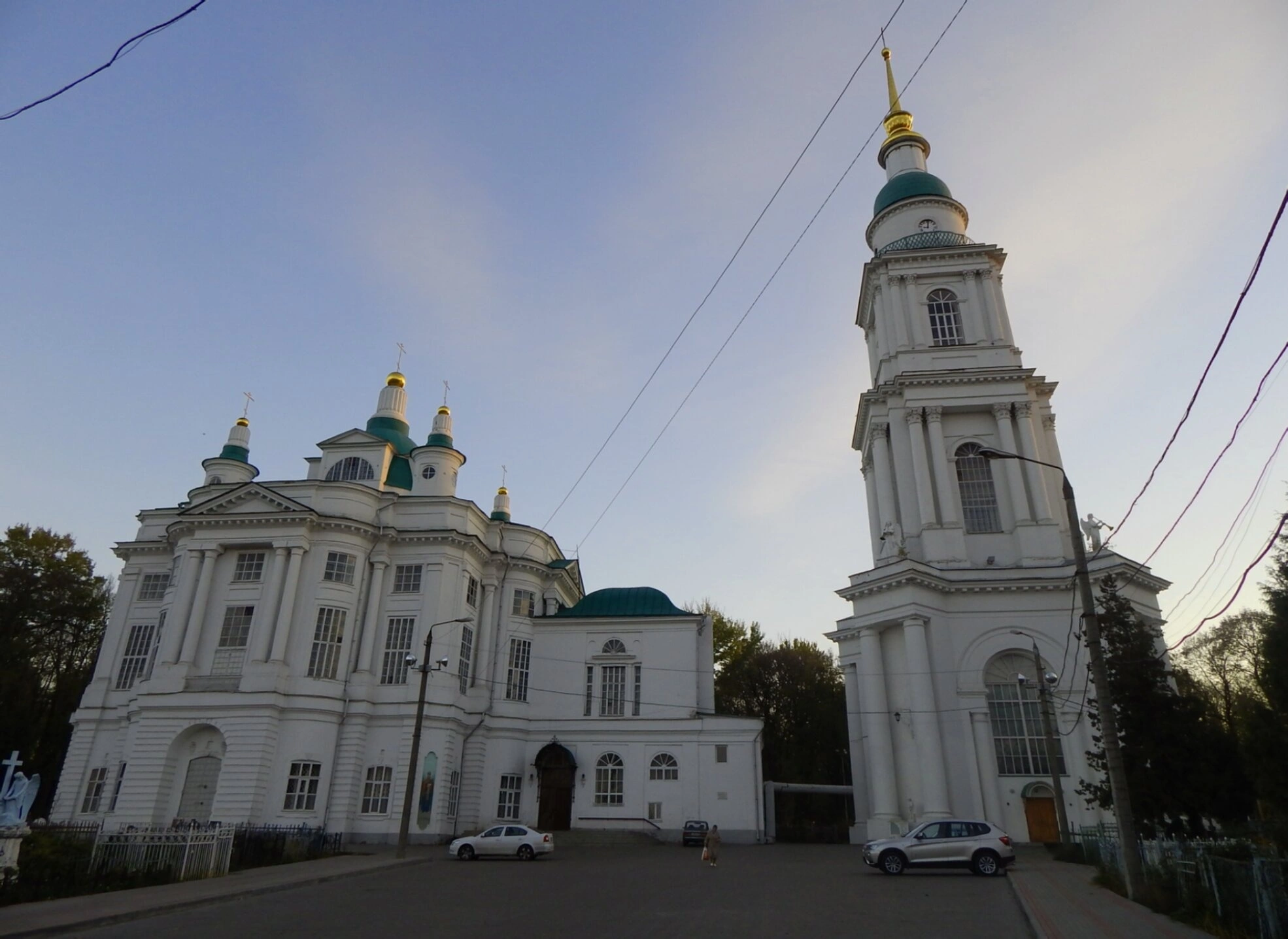 На представленной фотографии запечатлён величественный Всехсвятский кафедральный собор, являющийся одной из архитектурных доминант и главной духовной святыней города Тулы. Собор, освящённый в честь Всех Святых, располагается на высоком холме в исторической части города, что подчёркивает его значимость в силуэте городского ландшафта.