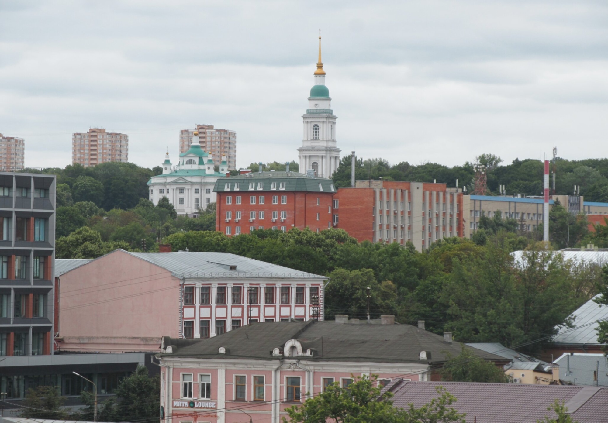 На представленной фотографии запечатлён живописный вид на город Тулу, открывающийся с высоты. Центральным объектом снимка является величественная колокольня Всехсвятского кафедрального собора, который является одной из архитектурных доминант и духовных символов города. Белоснежная четырёхъярусная колокольня, увенчанная зелёным куполом и сияющим золотым шпилем, гордо возвышается над городской застройкой, демонстрируя традиции русского классицизма в церковной архитектуре.