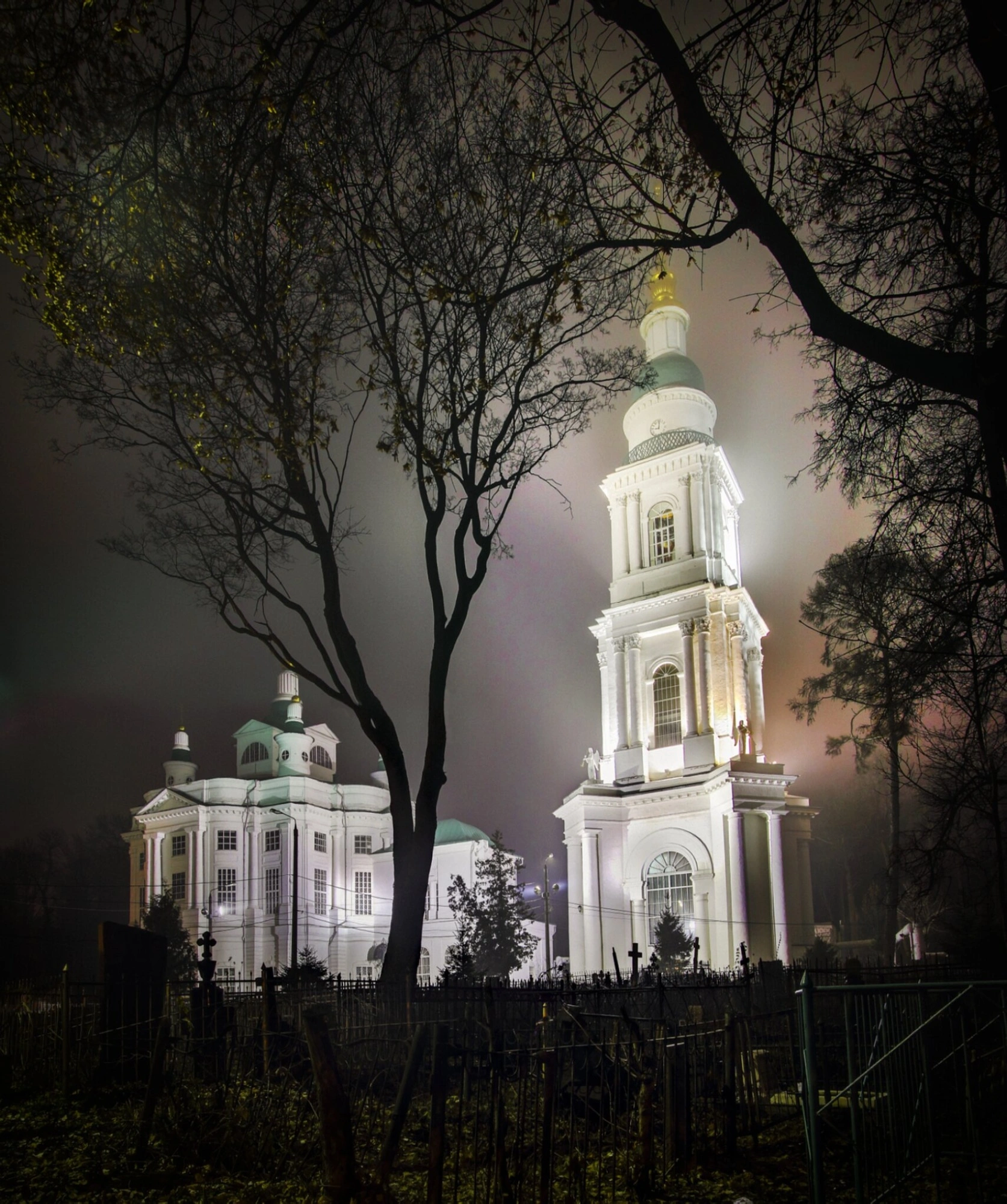 На переднем плане и по бокам фотографии видны кроны деревьев, лишённые листвы, что указывает на осенне-зимний период. В нижней части кадра просматривается территория исторического Всехсвятского кладбища с древними надгробиями и крестами, что подчёркивает сакральность места и его многовековую историю. Лёгкая дымка, окутывающая собор, придаёт изображению особую глубину, таинственность и одухотворённость, напоминая о вечном и бренном.