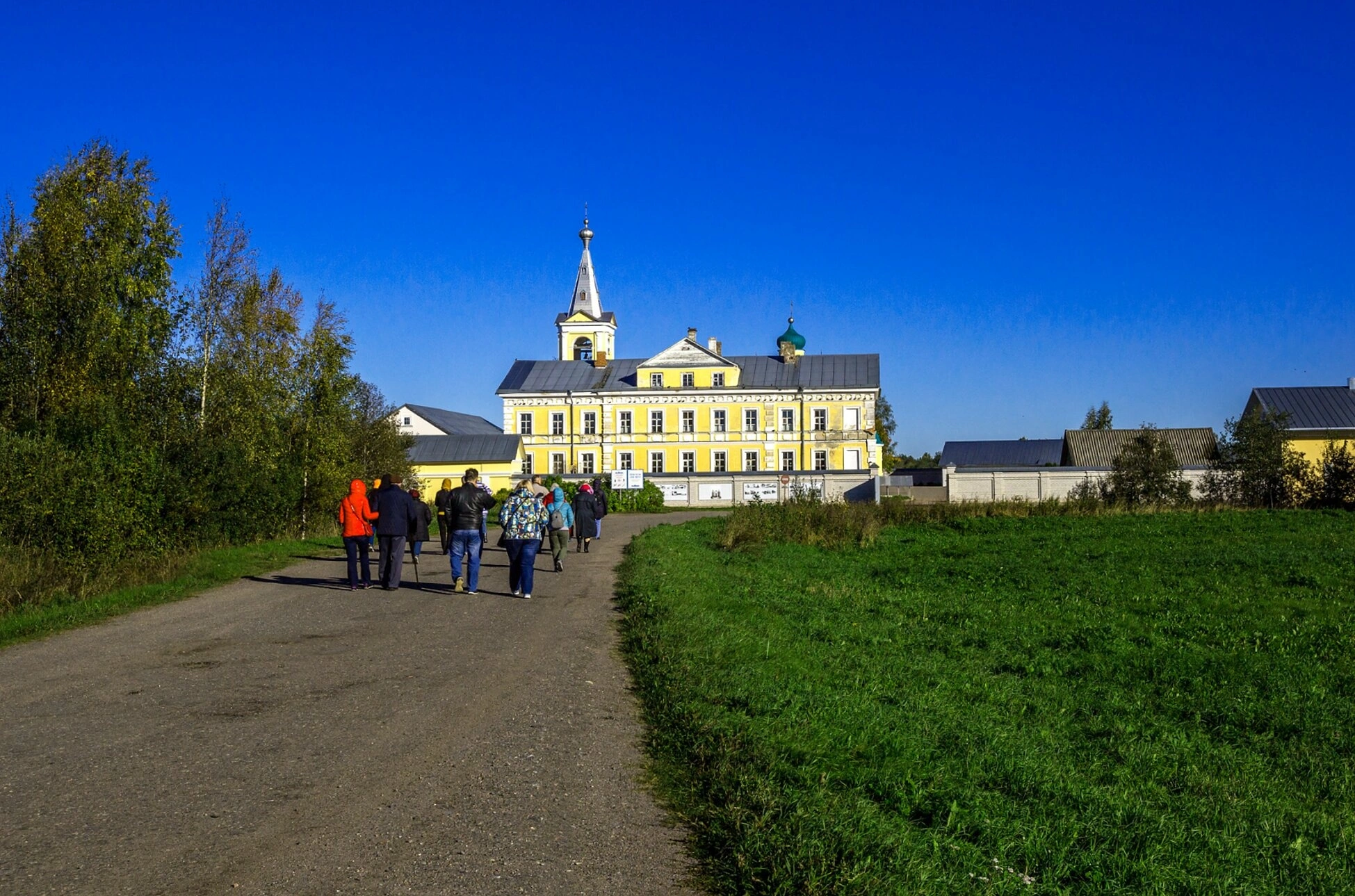 Перед святыми вратами обители раскинулось ухоженное зелёное поле, а по сторонам виднеются кроны деревьев, одетые в осенний багрянец. Группа паломников, изображённая на переднем плане, движется по грунтовой дороге к монастырским строениям, что символизирует путь верующей души к Богу. Чистое голубое небо над обителью, залитое солнечным светом, подчёркивает особую, благодатную атмосферу этого святого места.