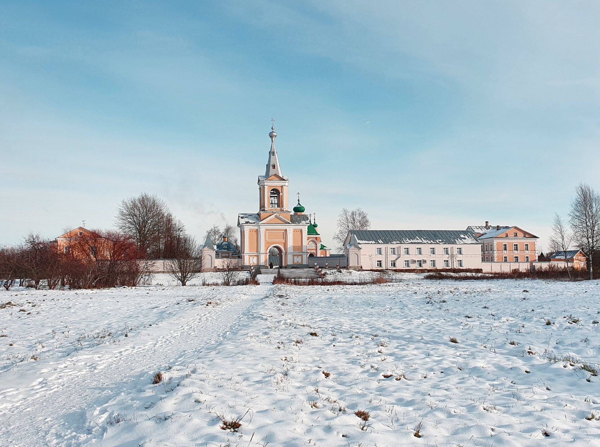 На представленной фотографии запечатлён Введено-Оятский женский монастырь — древняя православная обитель, расположенная в живописном месте на берегу реки Оять в Ленинградской области. Снимок сделан в зимнее время, когда монастырский комплекс, укрытый снегом, пребывает в благодатной тишине и молитвенном умиротворении, являя собой образ духовной твердыни и неземной красоты.