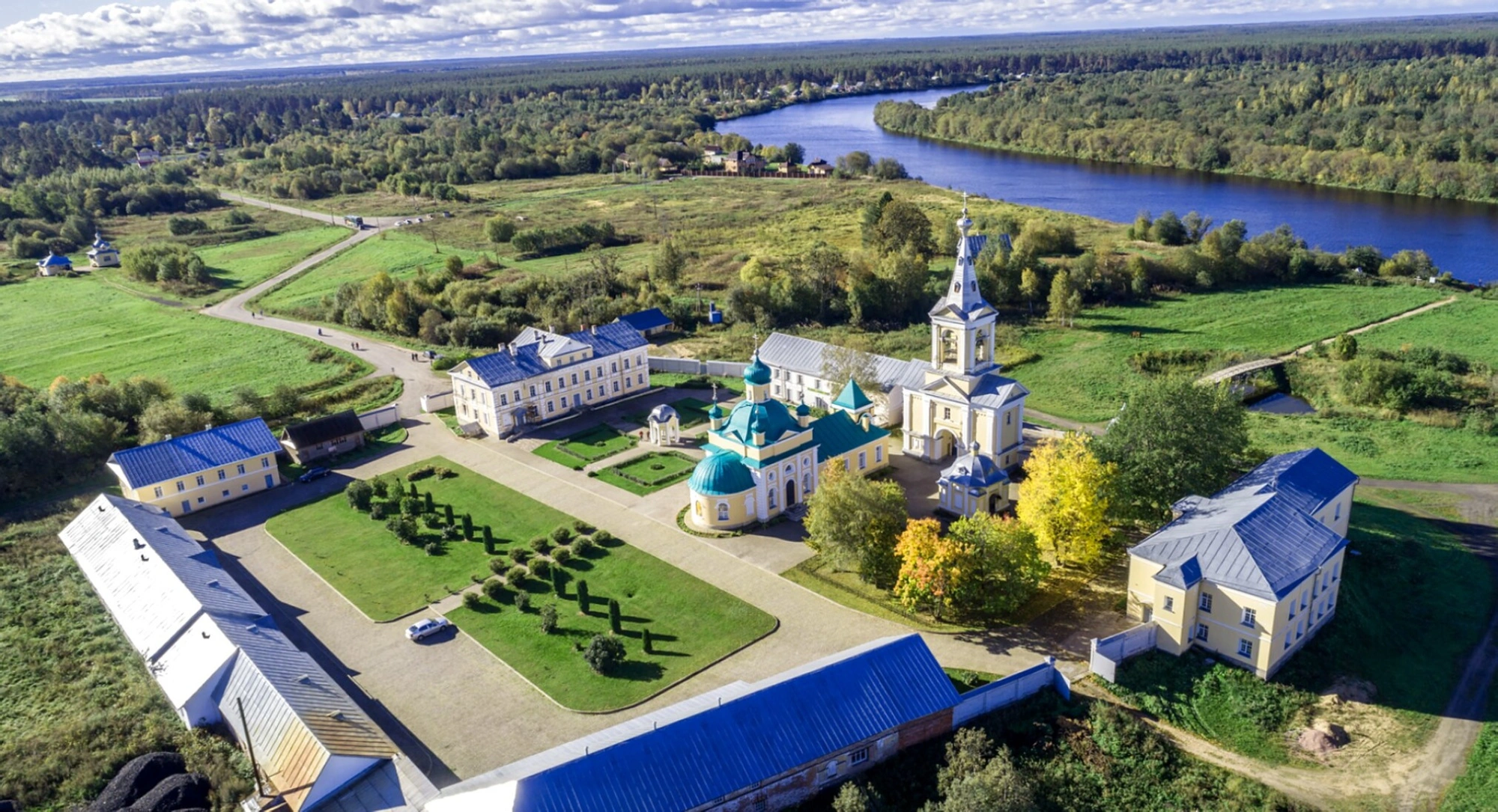 На заднем плане фотографии простирается спокойная гладь реки Оять, несущая свои воды вблизи монастырских стен. За рекой открываются бескрайние просторы русской природы — густые лесные массивы, подчёркивающие уединённость и благодатность этого места для молитвенных подвигов и духовного сосредоточения.