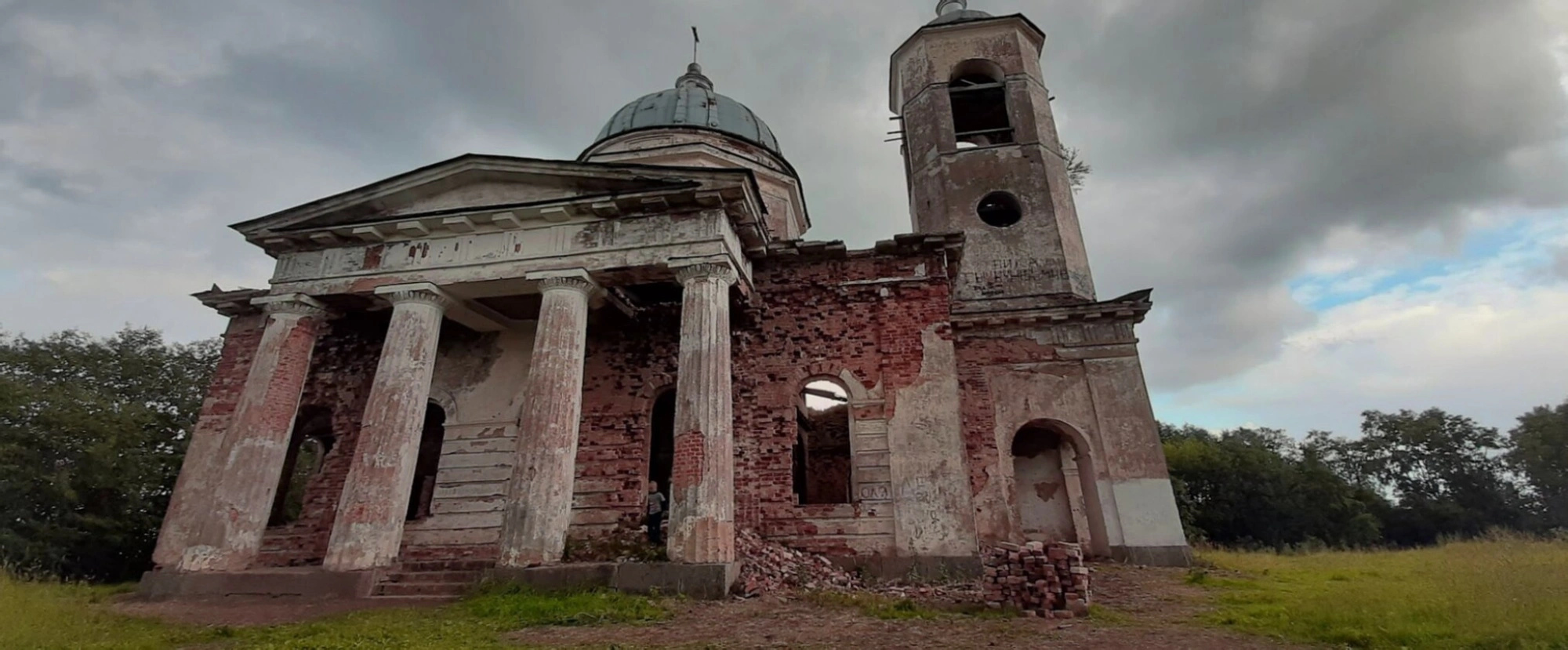 К сожалению, в настоящее время святыня пребывает в заброшенном состоянии. На фотографии отчетливо видны следы разрушения: кирпичная кладка стен местами обвалилась, обнажив внутреннюю структуру сооружения. Купол и колокольня частично утратили первоначальный вид, хотя сохранили свои архитектурные очертания. У основания колокольни заметны сложенные обломки кирпичей, свидетельствующие о длительном отсутствии реставрационных работ.