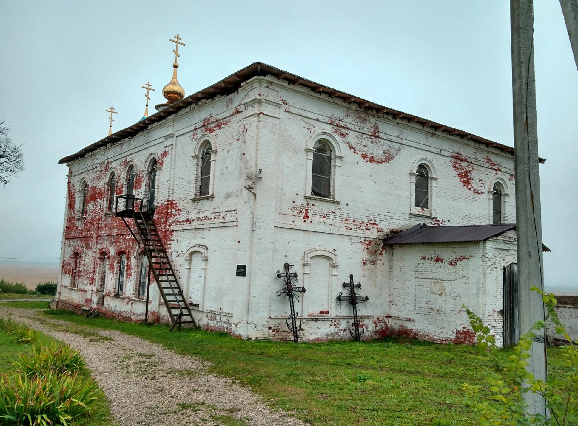 Здание храма, выполненное из белого камня и кирпича, демонстрирует черты классического русского церковного зодчества. Несмотря на следы разрушения и обветшания, в его облике угадывается былое величие. Арочные оконные проёмы, характерные для церковной архитектуры, и сохранившиеся золотые купола, увенчанные православными крестами, свидетельствуют о сакральном назначении постройки.